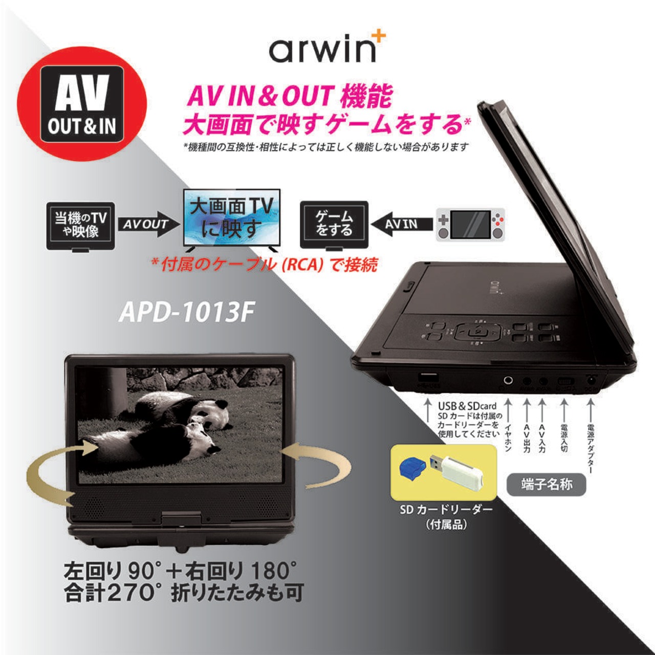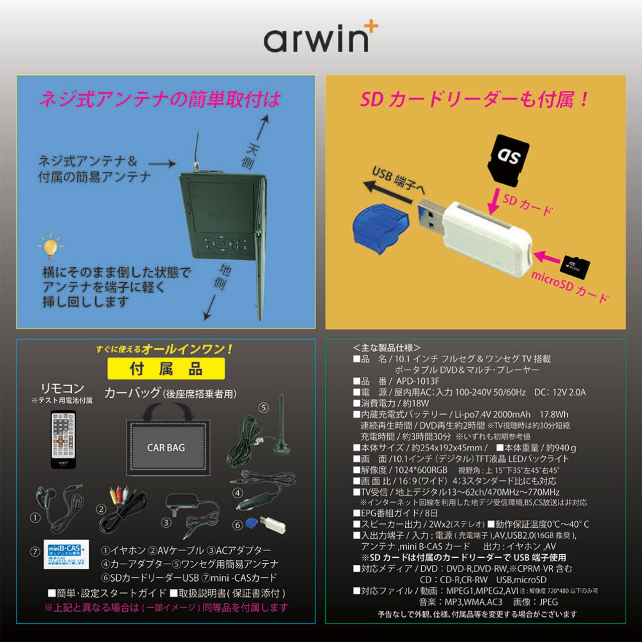 arwin 10.1インチ ポータブルフルセグDVDプレイヤー APD-1013F