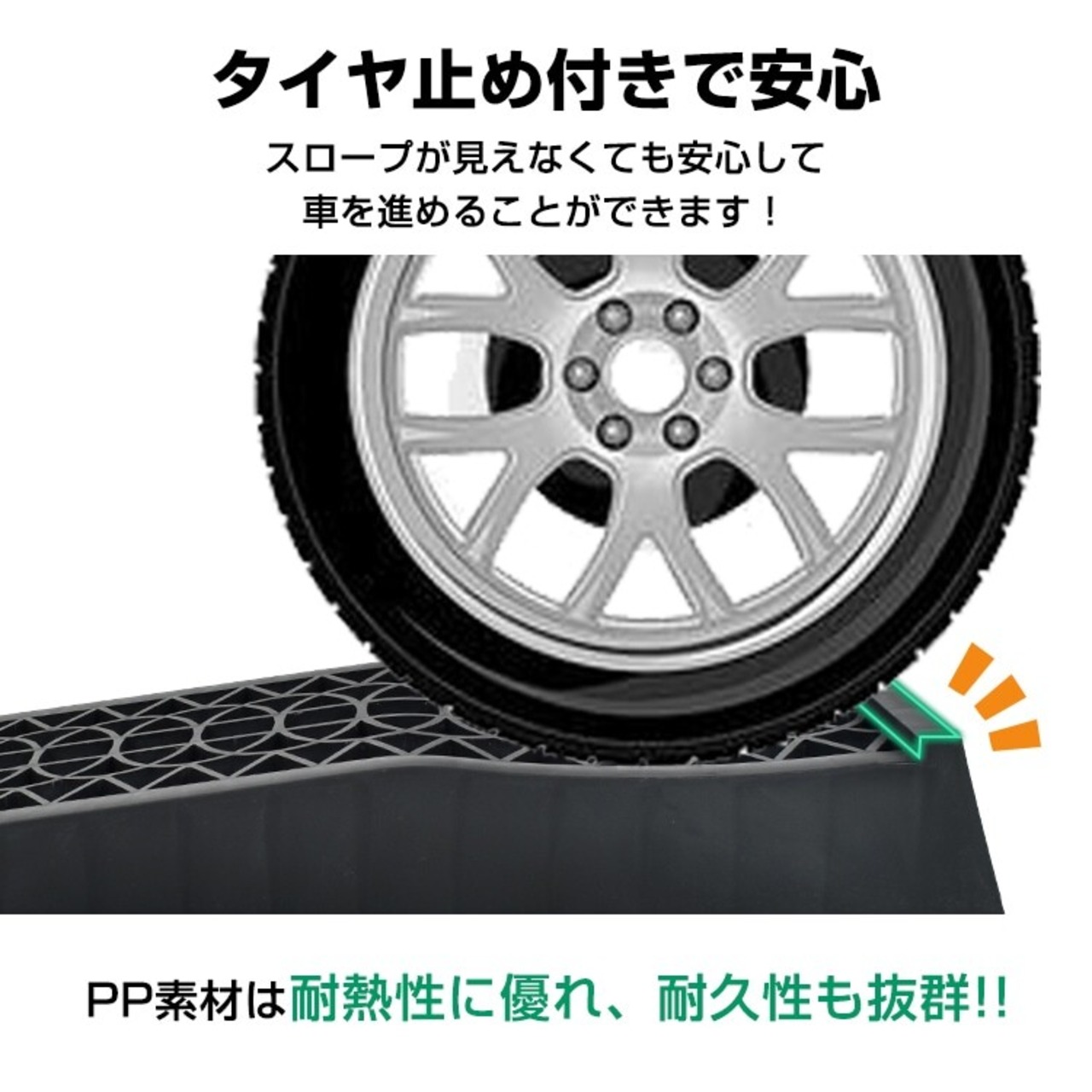 ■タイヤ止め付きなのでスロープが見えなくても安心して車を進めることができます。