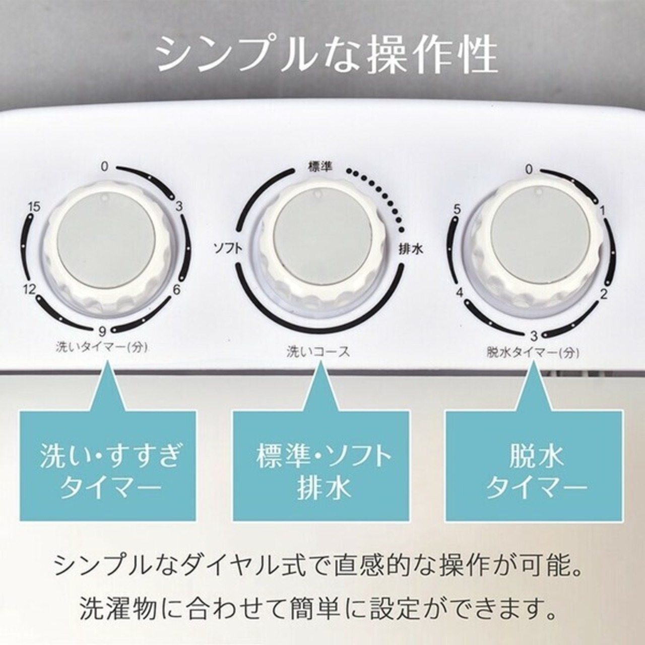 ●シンプルなダイヤル操作:洗い・すすぎタイマー、標準・ソフト/排水、脱水タイマー
