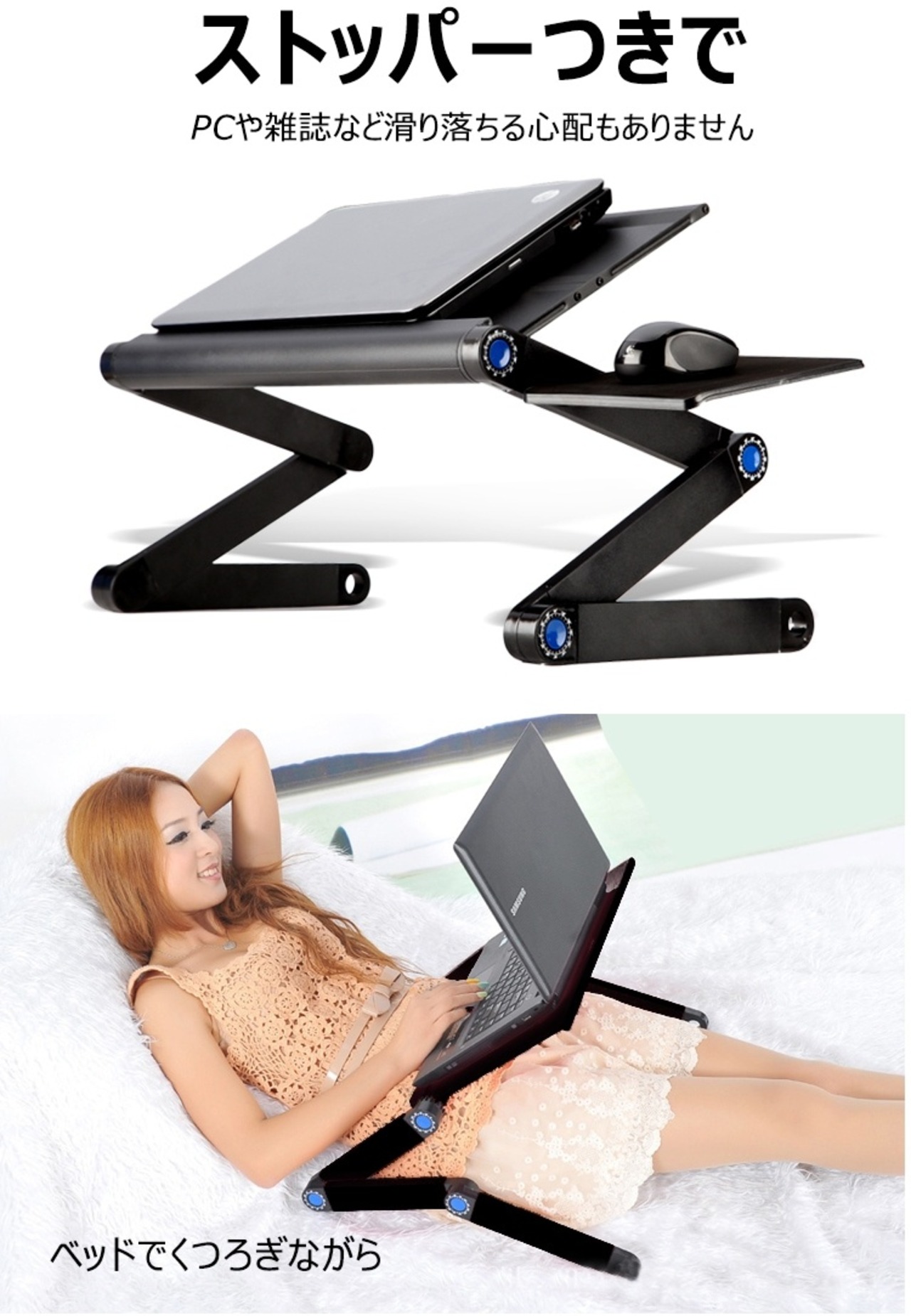 ■ストッパーつきでPCや雑誌など滑り落ちる心配もありません