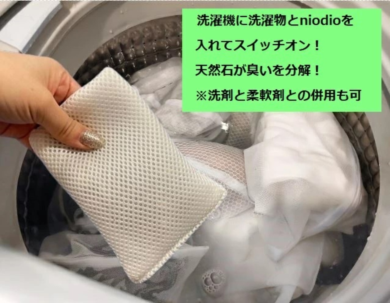 ・使いかたは簡単。洗濯機に洗濯物とniodioを入れてスイッチオン。 ・使った後は、なるべくniodioを干してください。もし干し忘れても、抗菌成分が雑菌からガード。 ・約1年で新しいniodioに交換してください。マグネットステッカーに使い始めた日付と1年後の日付を油性マジックで記入して、洗濯機に貼っておくと便利です。
