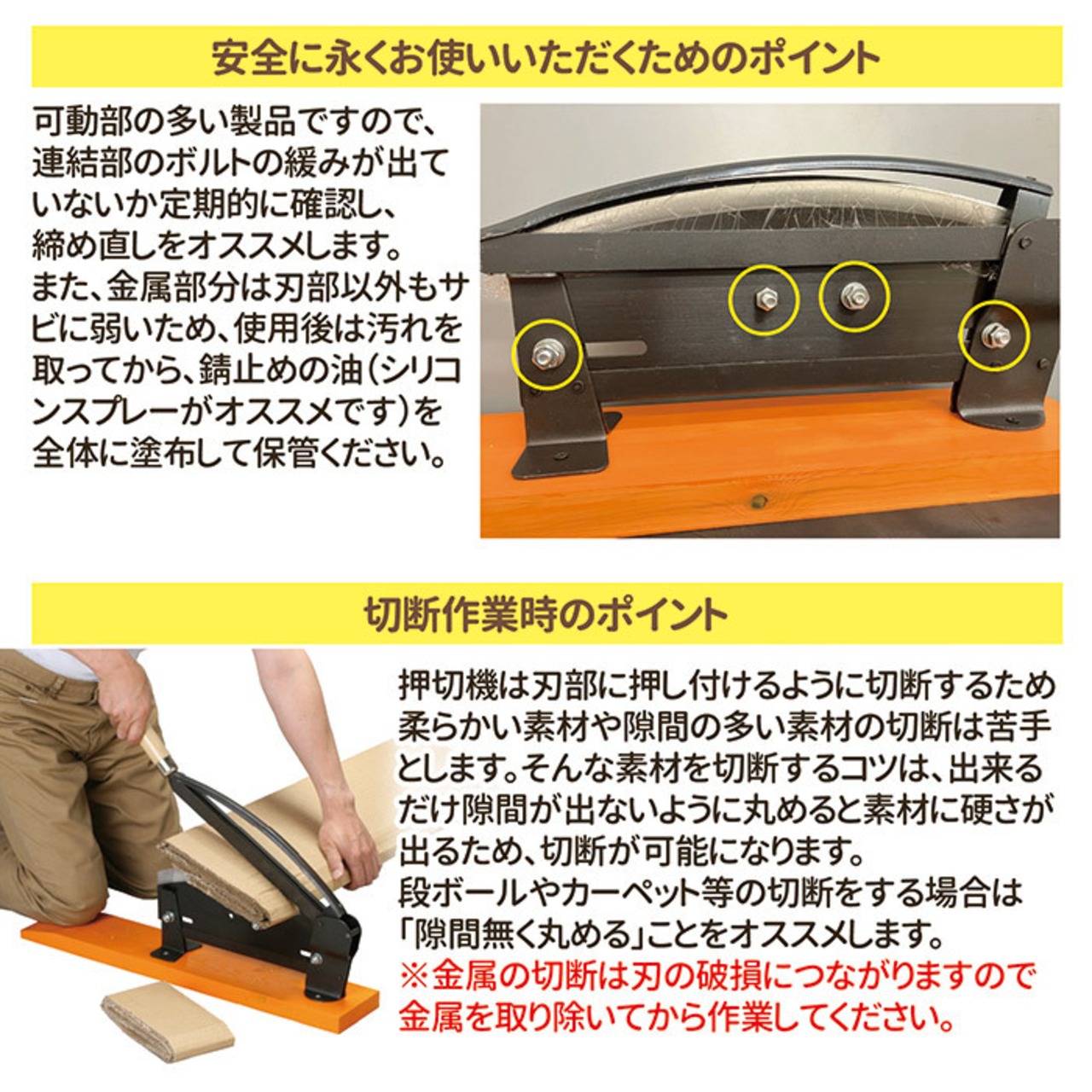 枝などを強力に切ることができる押切機です。これなら女性の方でも、ラクにゴミ処理ができる、と大人気です。本品は、刃の長さが大きい36センチタイプで、段ボールや不要になったカーペットなども余裕で切断できます。大きな刃が下側にあり、ハンドル部分で切断物を押して切断する構造です。より軽い力で切断できるよう、ハンドルを上げると刃が手前側にスライドし、ハンドルを下げると元の位置にスライドして動く仕組みにしてます。剪定後の木の枝やダンボール箱、カーペットなどの廃棄にも活躍します。