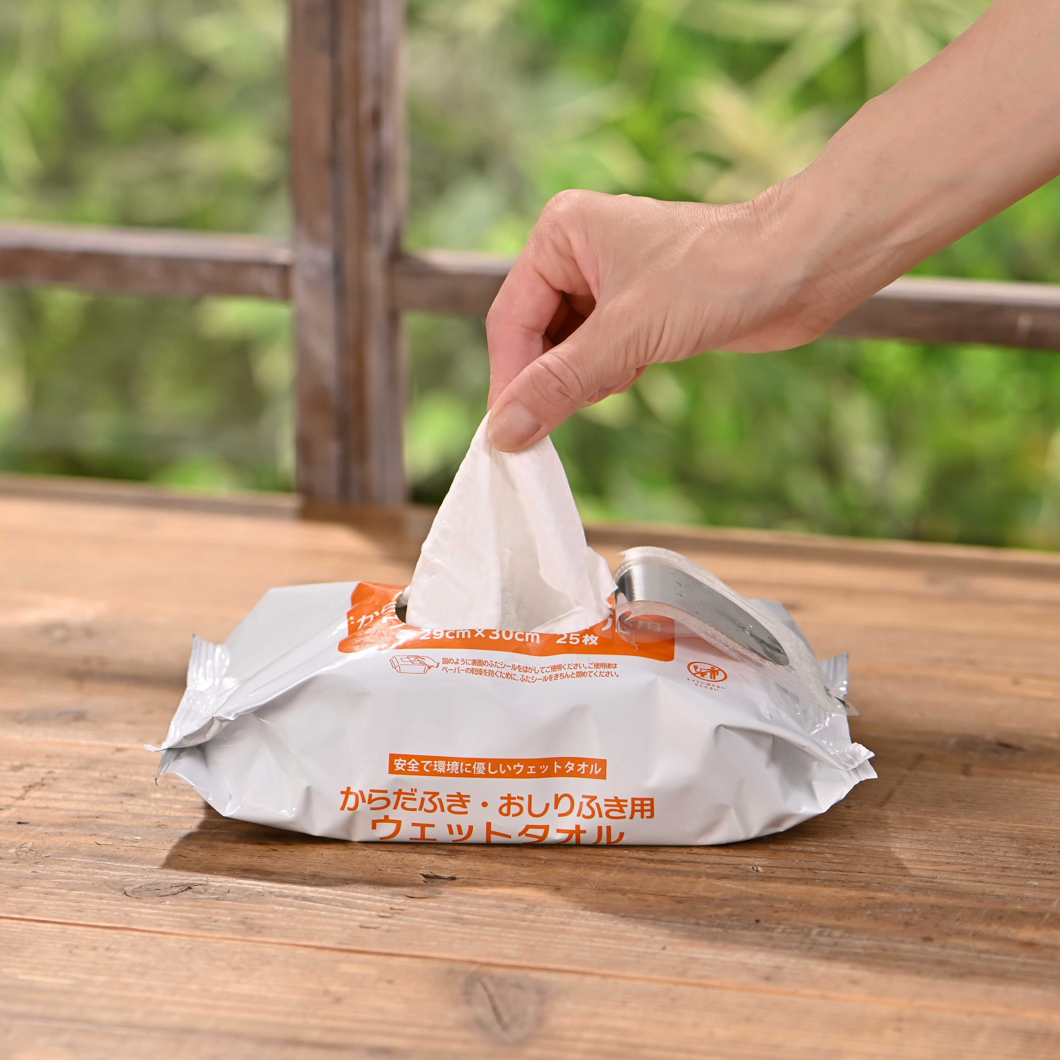 20cmX10cmX6cm 素材:綿・レーヨン 25枚入 成分:水、BG,オレスー12、ベンザルコニウムクロリド、ブチルカルバミン酸ヨウ化プロピニル、グリセレスー26、クエン酸、フェノキシエタノール、ポリクオタニウム-51、モモ葉エキス 日本製