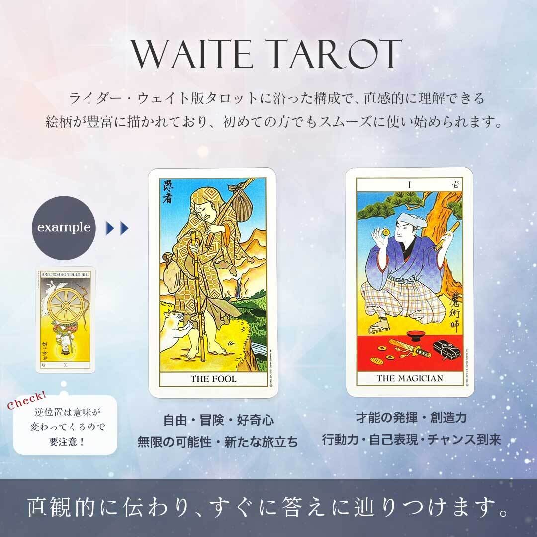 「浮世絵タロット」は、日本人アーティスト・古田浩二氏による美しいイラストで構成された78枚の本格タロット。大アルカナは、歌舞伎役者・僧侶など日本の伝統的な人物をシンボルとして描き、小アルカナには刀、杖、椀、江戸時代の貨幣など和のモチーフを使用。