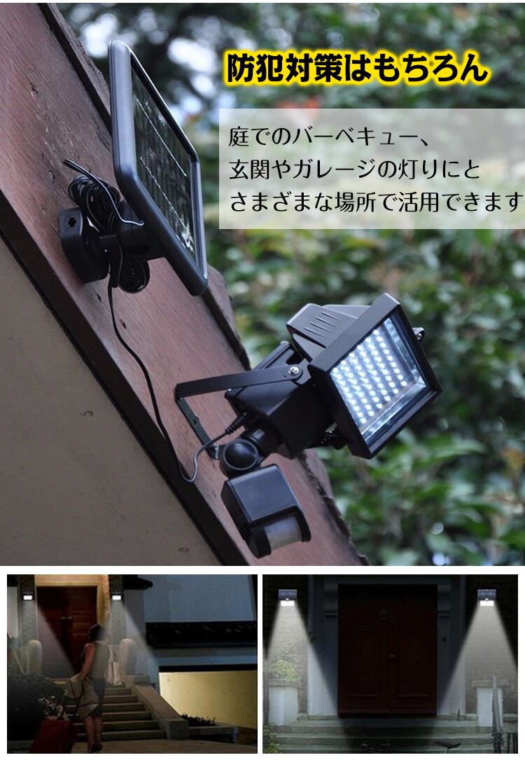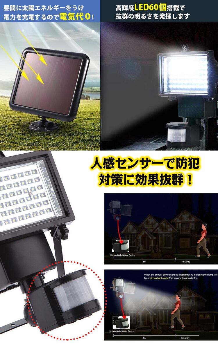LED 60 人感 センサー ソーラー 投光器 明るい 調整 節約 車庫 防犯 玄関灯 作業灯 セキュリティ DIY