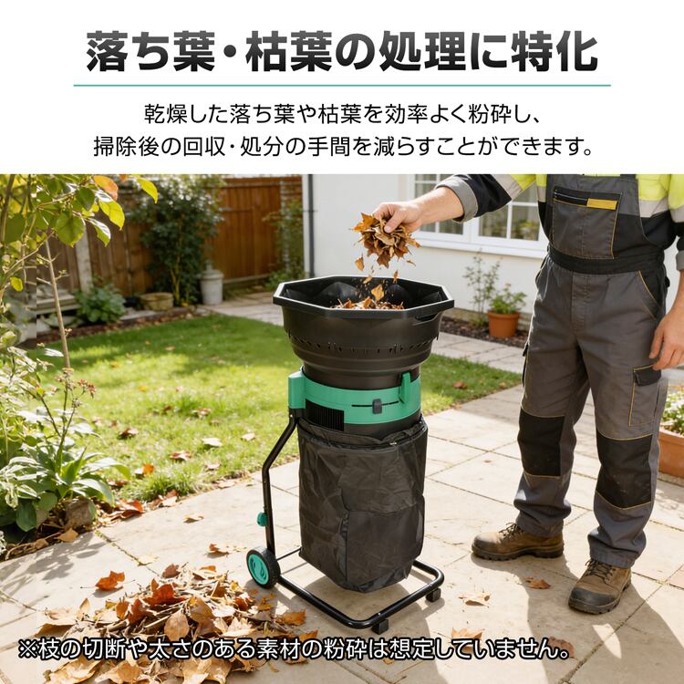 電動粉砕機 ガーデンシュレッダー 家庭用 落ち葉処理 枯葉対応 回収袋付き タイヤ付き 過熱保護 園芸用