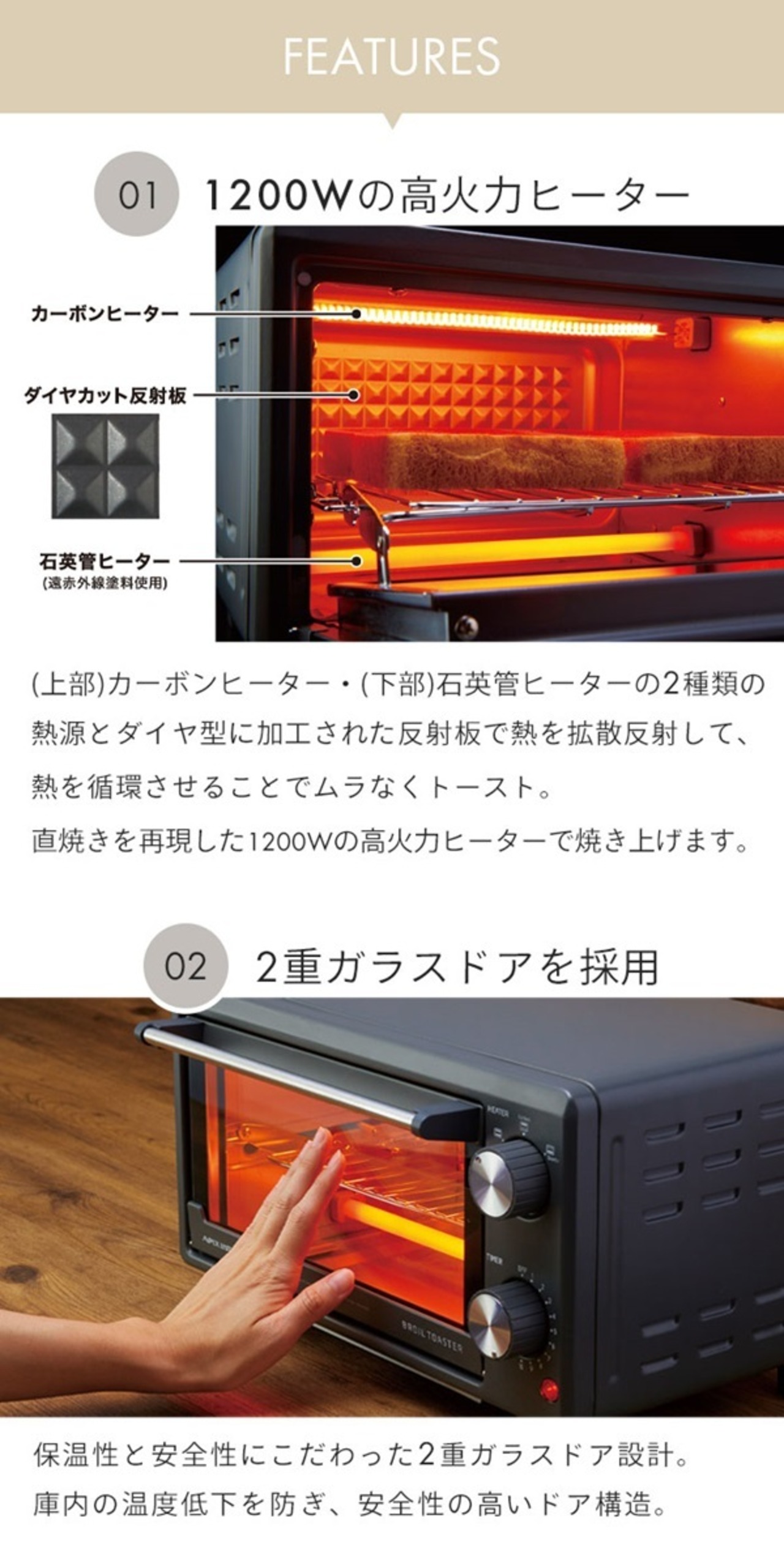 ◆2種類(カーボンヒーター・石英管ヒーター)の熱源と反射板で、1200Wのハイパワーでムラなく焼き上げます。