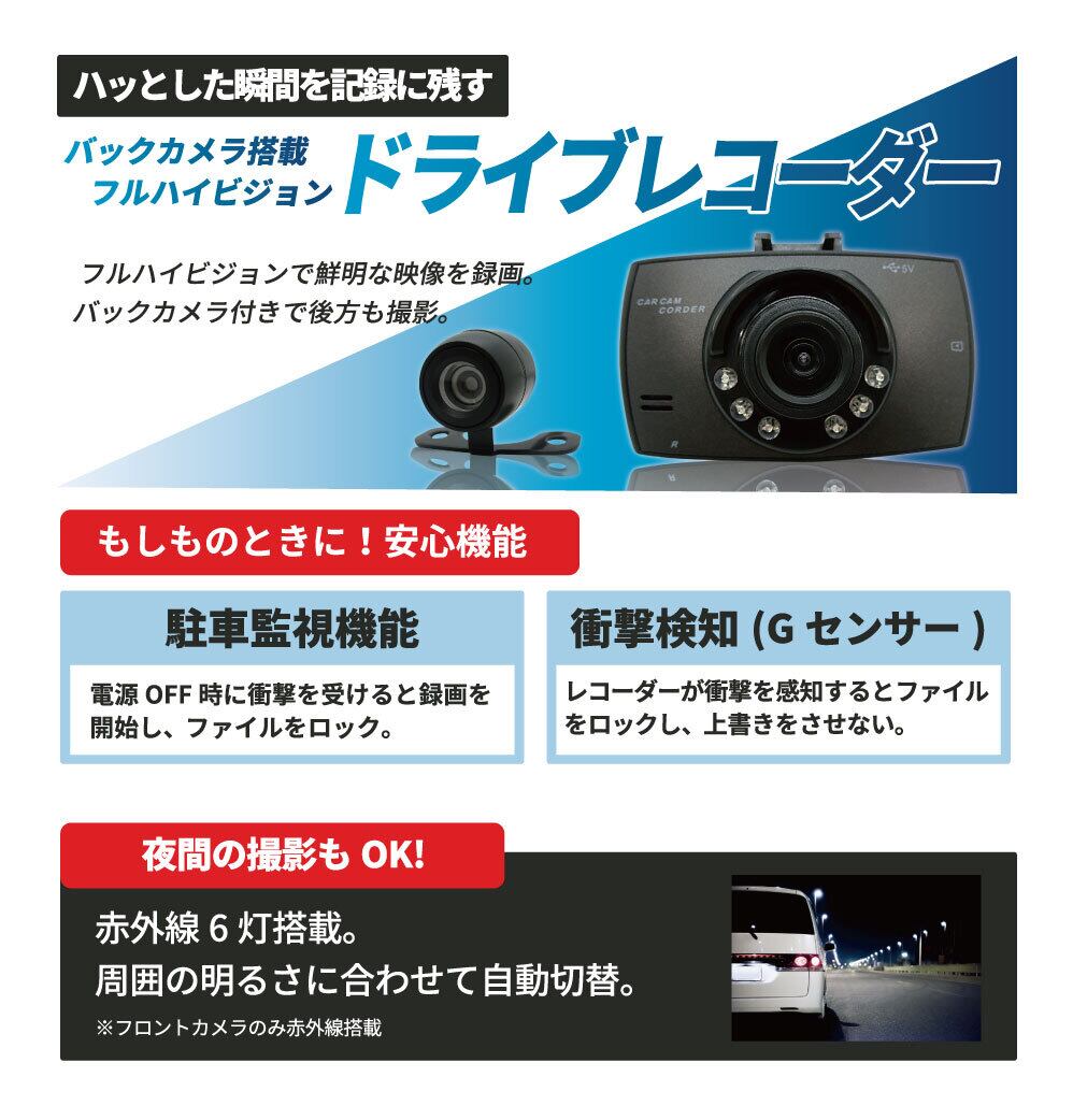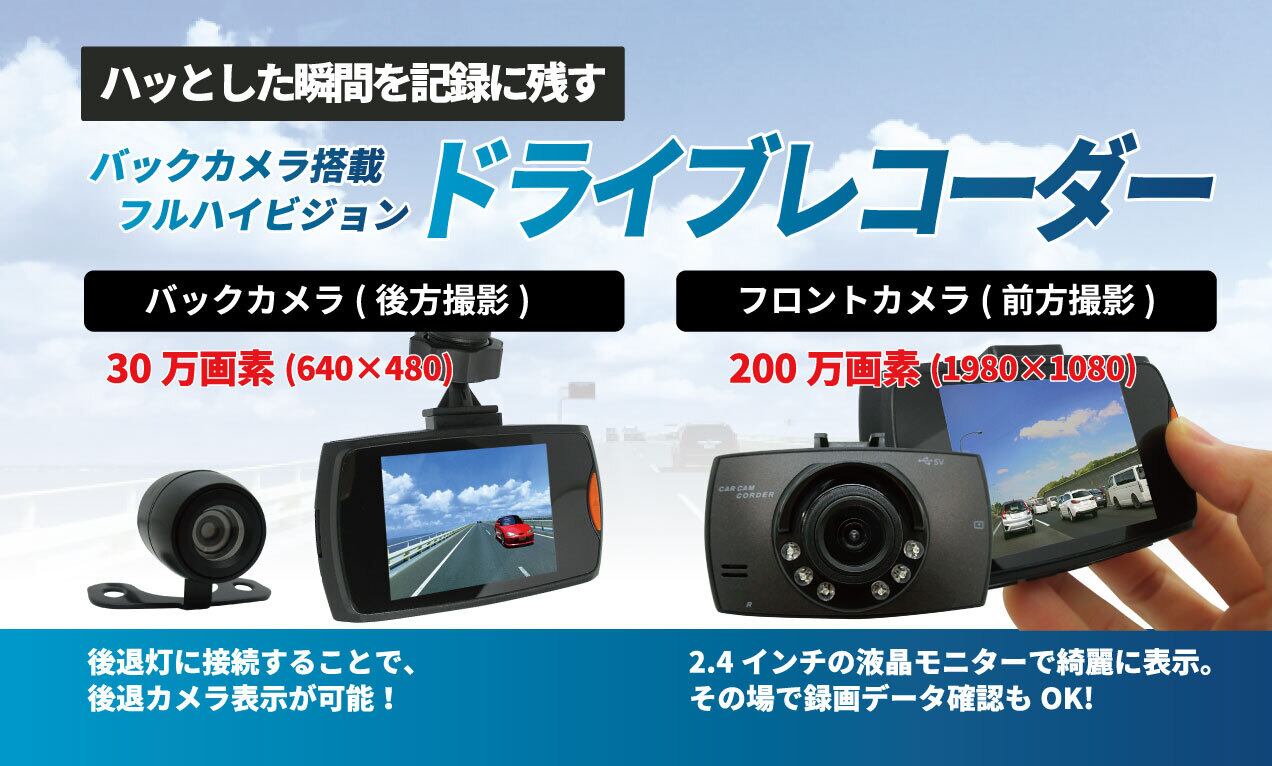 バックカメラ搭載のフルハイビジョンドライブレコーダー。