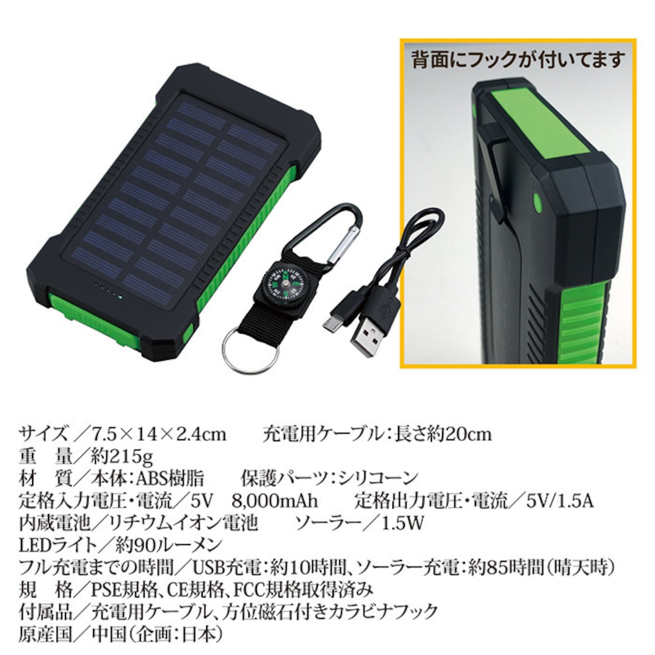 ●付属品/充電用ケーブル、方位磁石付きカラビナフック