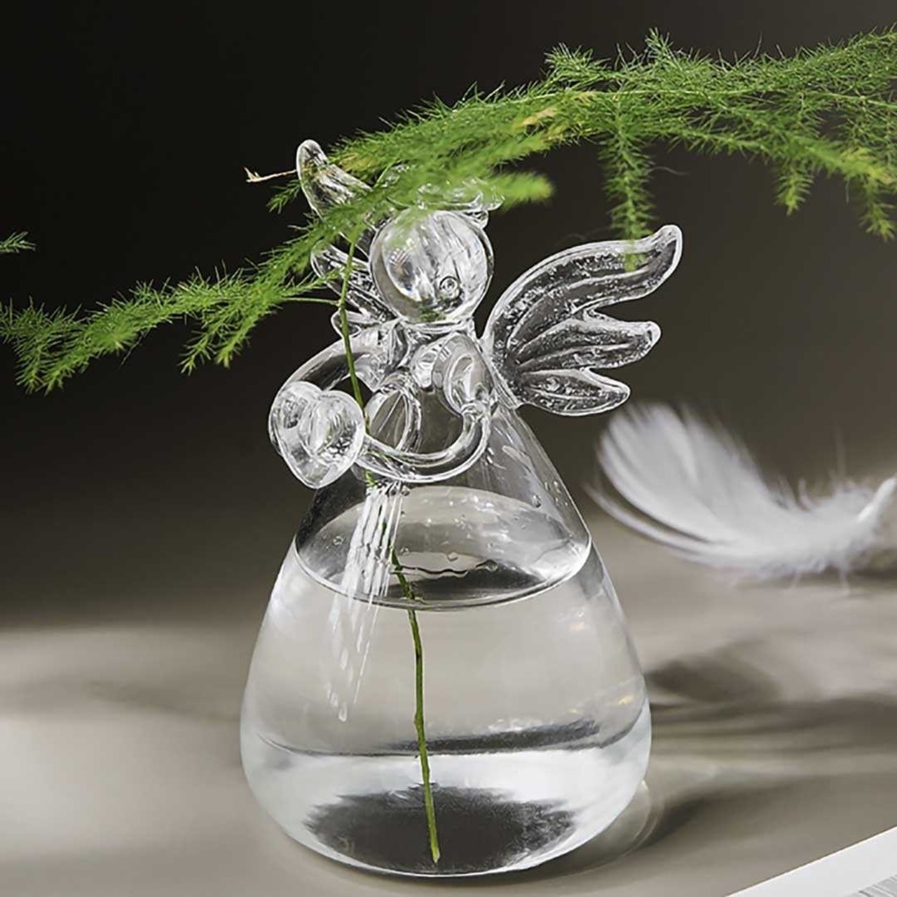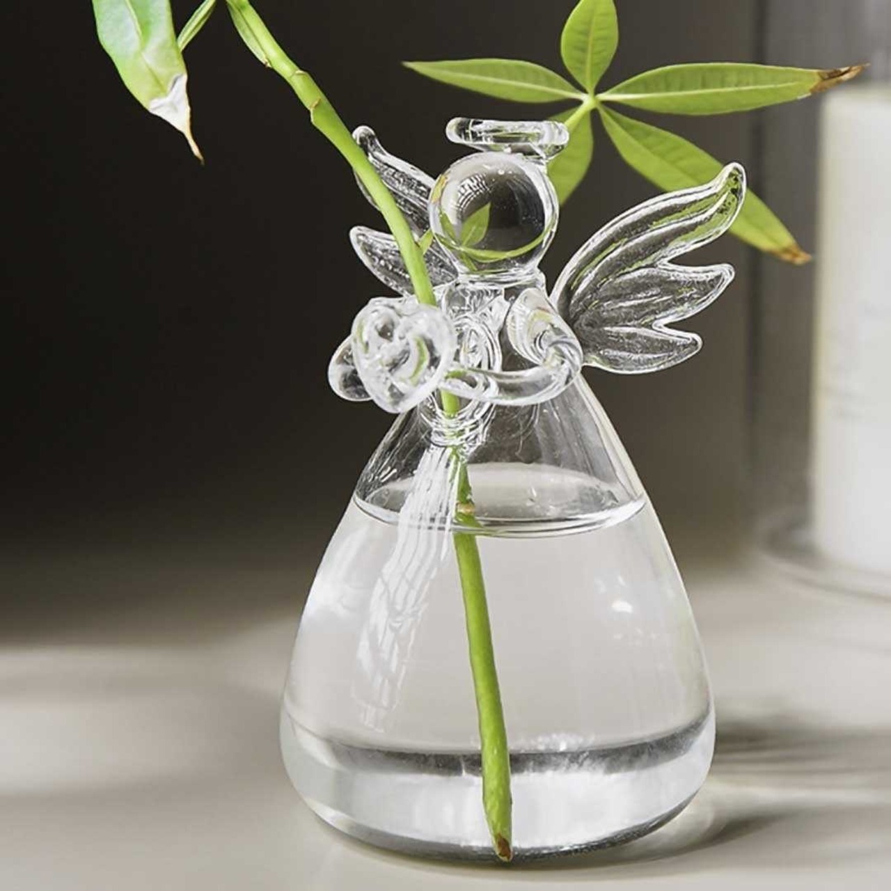 ガラス容器の中で植物を育てて鑑賞するグリーンインテリア。 かわいい天使型の花瓶でのびのびと育つ葉、水の中で広がる根など、植物が育っていく過程を見守ることができます