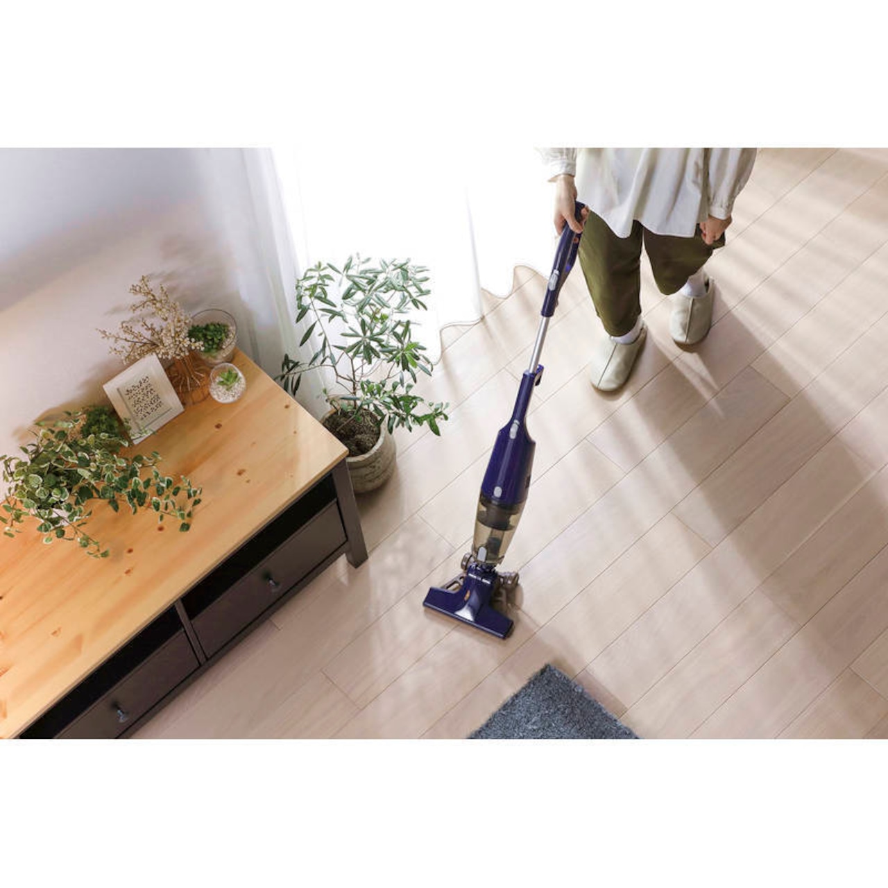 コードレスで吸い取りながら拭き掃除ができるワイパー・2.0kg未満の本体重量でお掃除らくらく・布団ノズルで布団やベッドのお掃除にも・簡単にゴミ捨て出来る「楽ステ」機構搭載・吸込仕事率20W。紙パック不要のサイクロンで経済的
