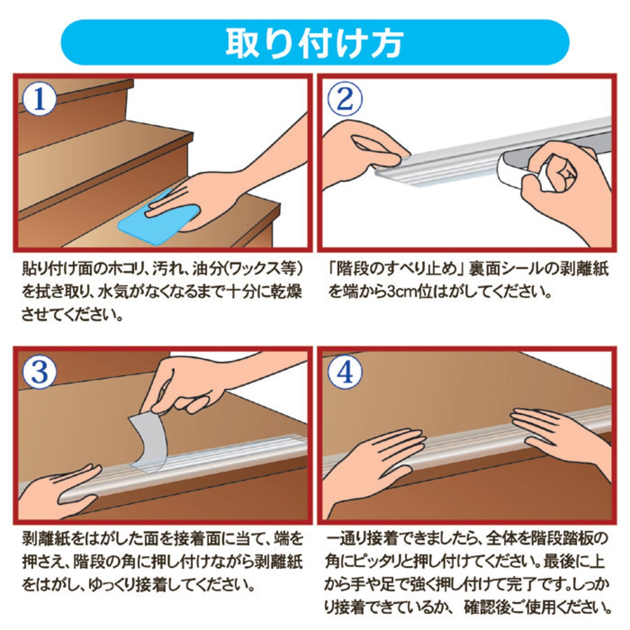 ※本品をはがす際、無理にはがそうとすると階段踏板の表面がキズついたり、めくれあがる場合があります。ヘアドライヤー等で温めると粘着剤が柔らかくなり、はがしやすくなります。少しづつ丁寧にはがしてください。