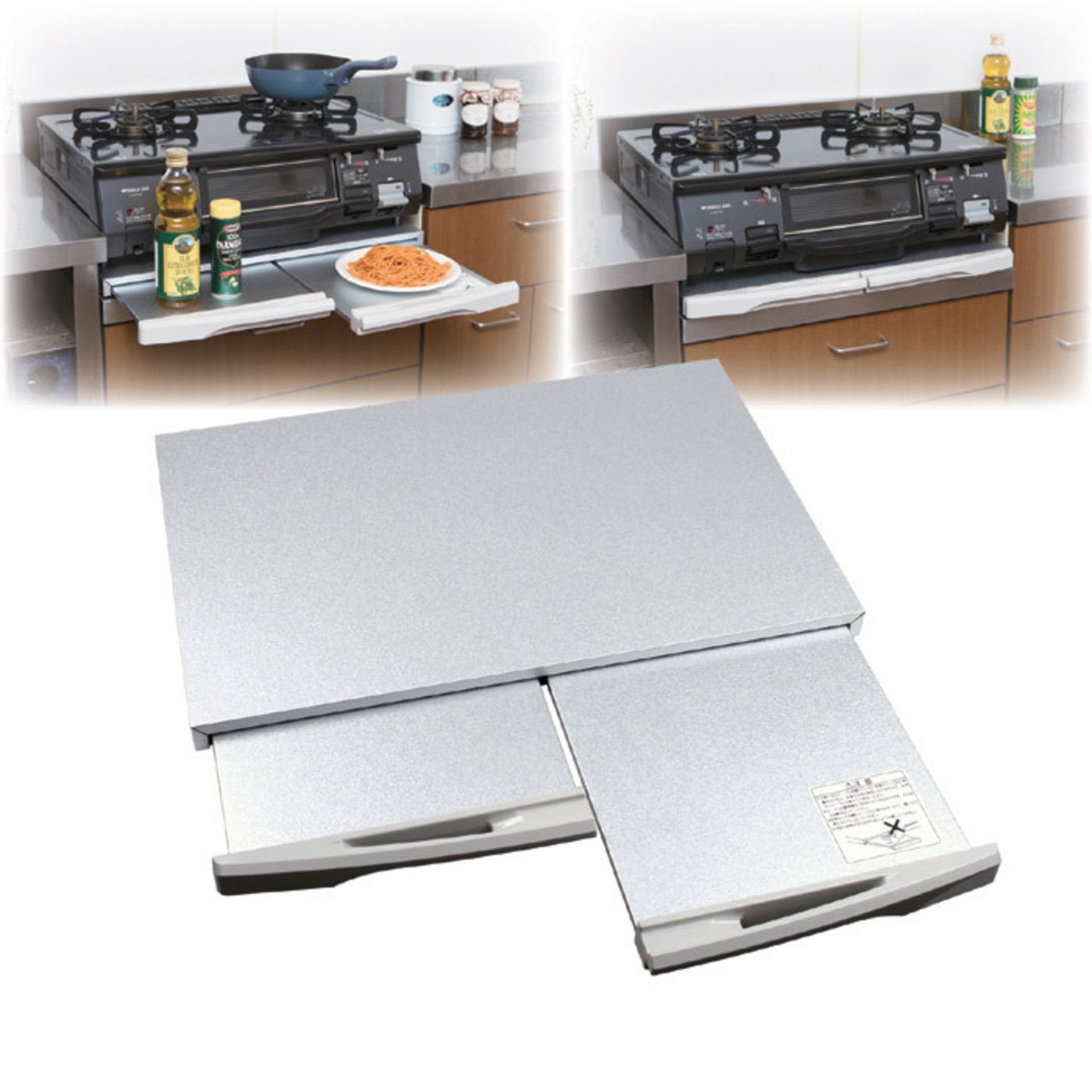 調理中、キッチンスペースは意外と狭いものです。用意した材料や調味料などを限られたスペースに置いての調理はまさに格闘ですよね。そんな限られた場所でオススメなのがガスレンジの下にセットするスライドテーブルです。ガスレンジをお使いのキッチンでしたら設置がカンタンにできます(埋め込みのユニットキッチンには設置不可)。テーブルは左右2枚に独立した形状になってます。