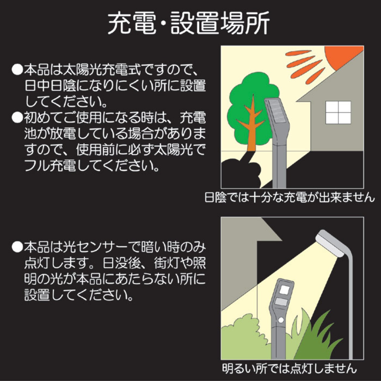 周囲が暗くなるといくら照明があっても足元は暗くて不安です。本製品は、そんな足元を明るく照らすようにデザインされたソーラー充電式のLEDライトです。人感センサーを内蔵してますので、周囲が暗くなり、人が近づくと点灯してくれます。足元を明るく照らしてくれるだけでなく、モード切替えで「威嚇」にも役立つフラッシュ点滅も可能になりました。夜間の防犯対策の一つとして、また、小動物の侵入の威嚇にも期待できます。最大約100ルーメン(切替モード、電池残量により変化します)の明るさでしっかりと照らしてくれます。LEDは白色のSMDチップを採用してます。日中の周囲が明るい状態では作動せずに、ソーラーパネルで充電を行います。防水構造になってますので、屋外で安心して設置できます(水没に対しての性能はございません)。