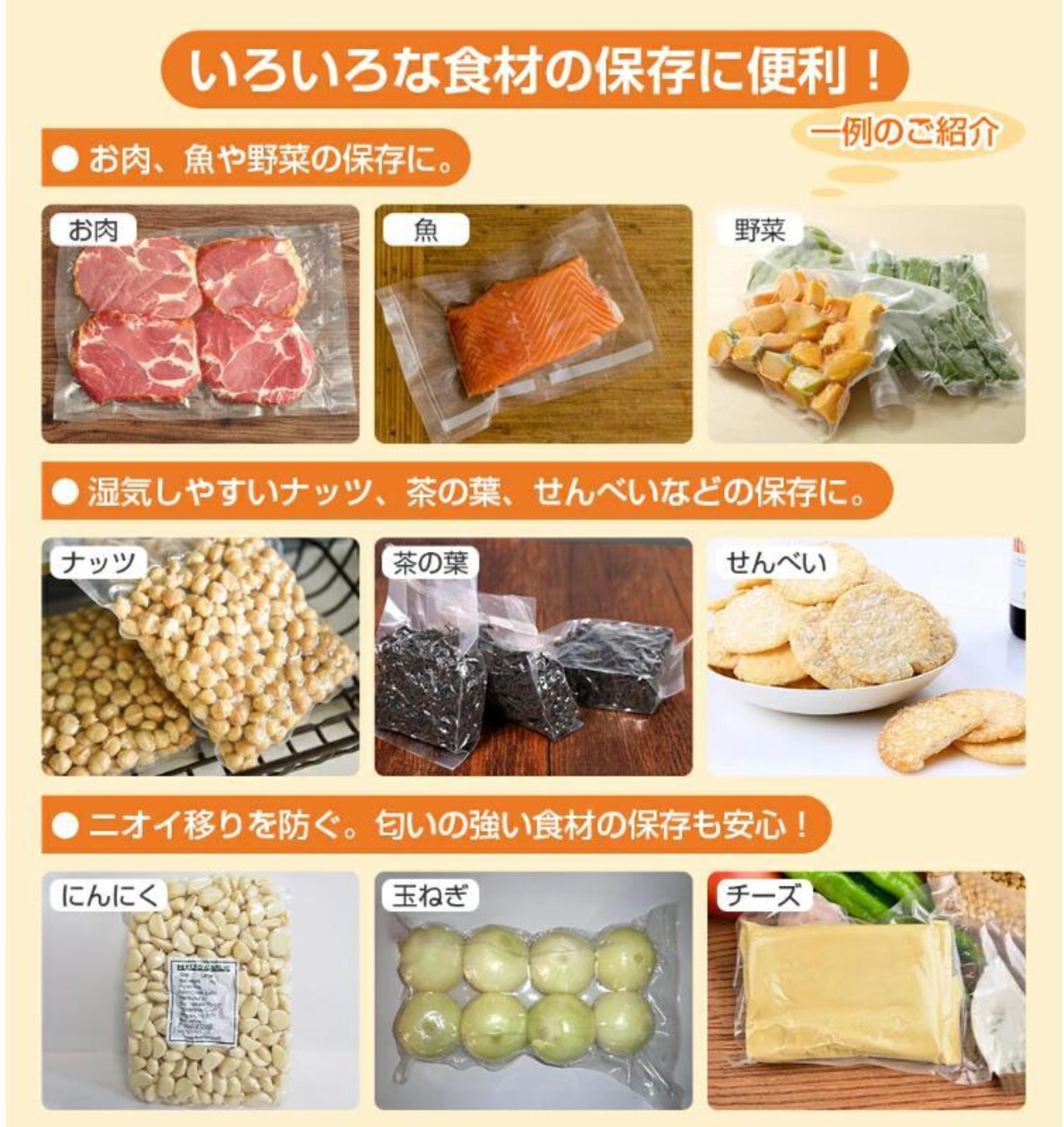 よくばら売りの食品を買ったり、保存したりする人々にとって、真空パックはもっと安全なばら包装の方式を提供します。空気を抜き、湿気、細菌、ほこりなど隔離させ、食品の鮮度や栄養を保つことができ、食品の腐敗、酸化、変質を減らして、ニオイ移りにも防止できます。冷蔵しても、冷凍しても、真空パックの食品の賞味期限は普通の貯蔵方式の時間の3~5倍になります。