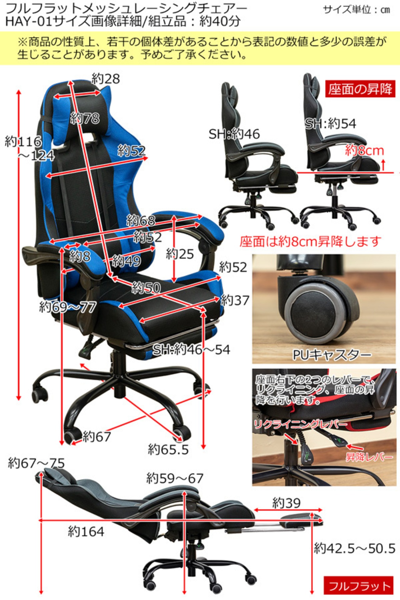 フルフラットメッシュレーシングチェア BK/BL/GR/RD