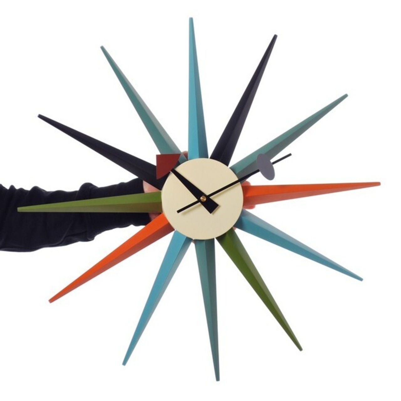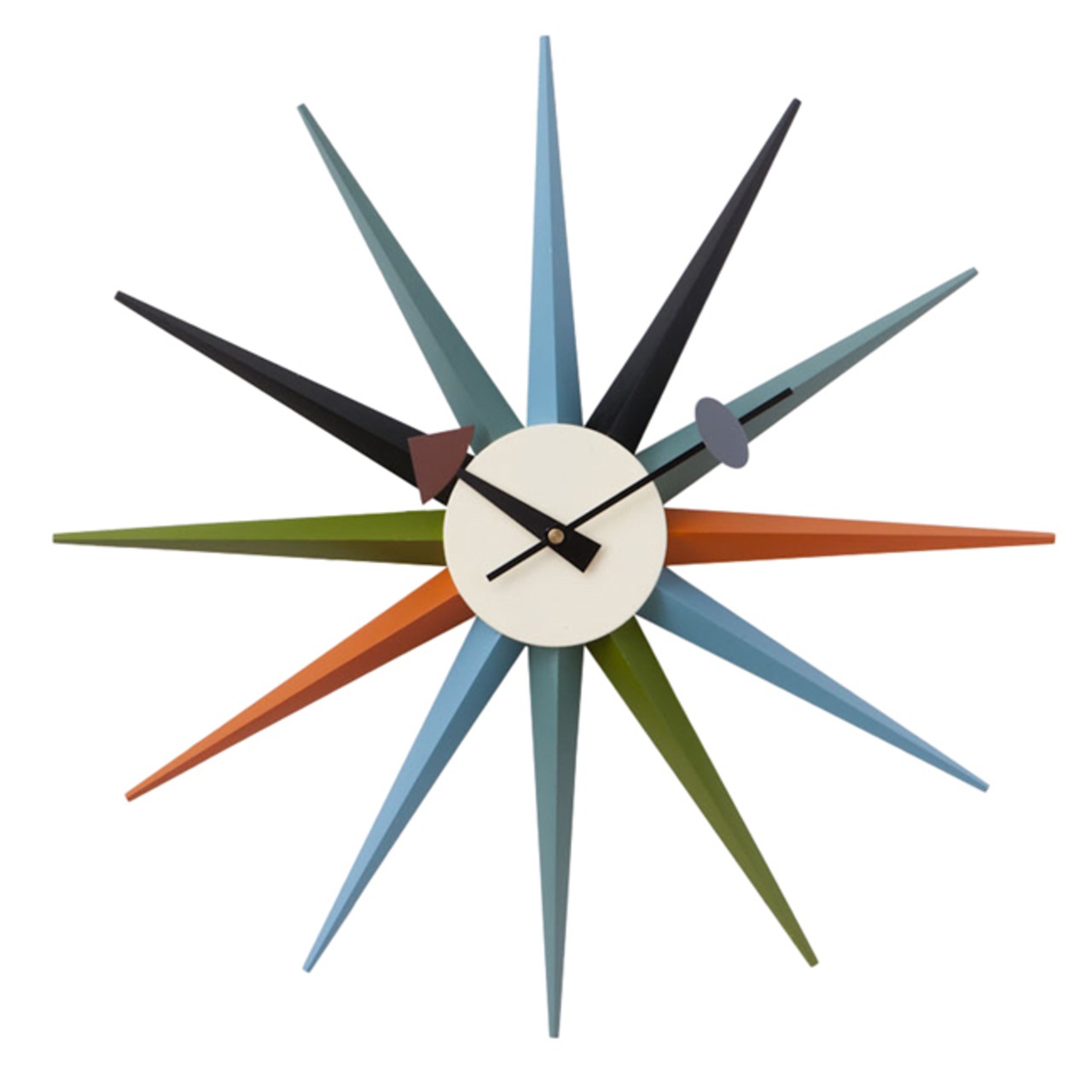 <商品について>サンバーストクロックは1957年にジョージ・ネルソン(George Nelson)によって製作されました。 太陽が光輝くような様をモチーフにしたような、遊び心あふれるデザインとなっております。 突き出すような光の線は、カラフルにペイントされており見るものを楽しくさせてくれます。 また照明によって出来る影が、白い壁に投影されるとインテリアのポイントとなります。 ネルソンクロックとも呼ばれる一連のシリーズは、その特徴的な形態からデザインの古典的なアイコンともなっています。 時計としての機能だけではなく、見て楽しいインテリアのアクセントとしても非常に人気があります。 ミッドセンチュリーを彷彿とさせるアメリカンテイストのお部屋にはもちろん、モダンなテイストのインテリアにもどんなスタイルにもマッチします。