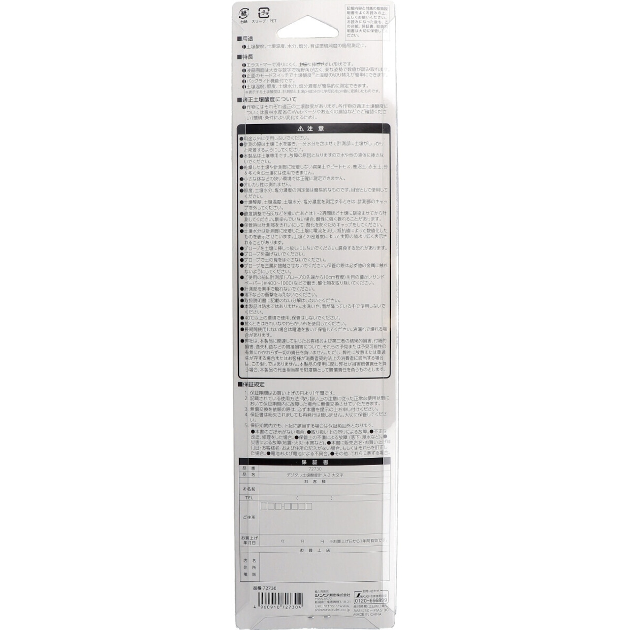 土壌酸度(12段階):pH3.5~9.0(最小表示 pH0.5※、精度 ±pH0.5) 土壌温度:5~40度(最小表示 1度、精度 ±1度)