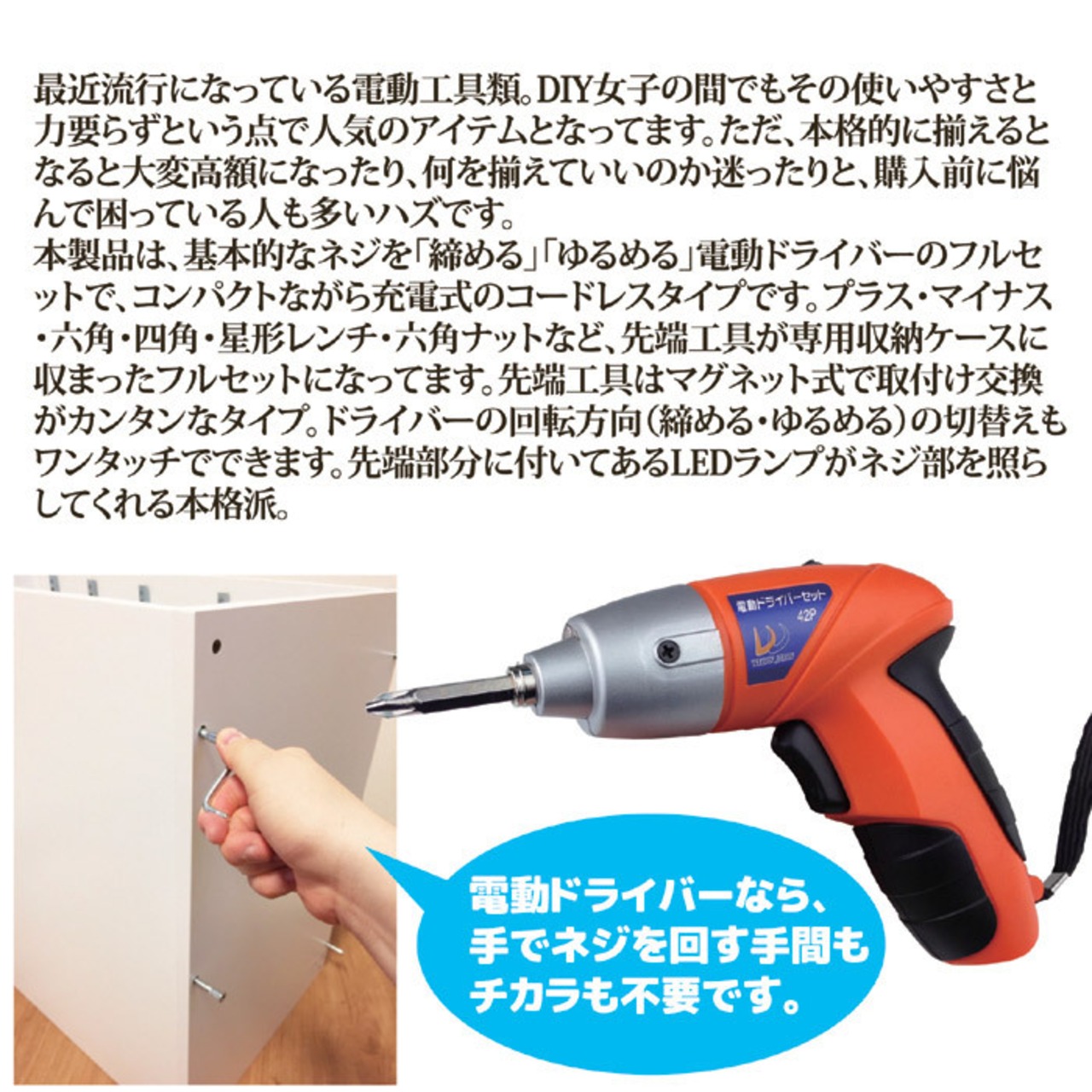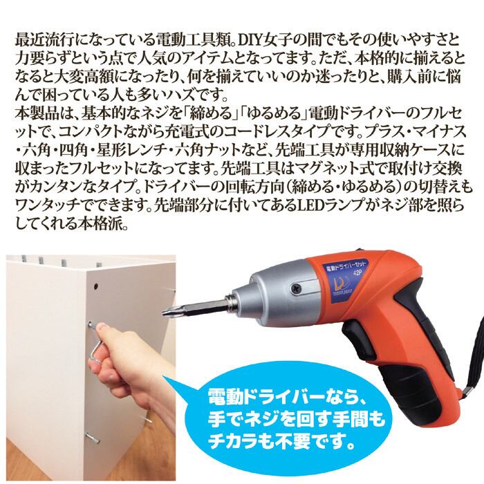 最近流行になっている電動工具類。DIY女子の間でもその使いやすさと力要らずという点で人気のアイテムとなってます。ただ、本格的に揃えるとなると大変高額になったり、何を揃えていいのか迷ったりと、購入前に悩んで困っている人も多いハズです。本製品は、基本的なネジを「締める」「ゆるめる」電動ドライバーのフルセットで、コンパクトながら充電式のコードレスタイプです。プラス・マイナス・六角・四角・星形レンチ・六角ナットなど、先端工具が専用収納ケースに収まったフルセットになってます。先端工具はマグネット式で取付け交換がカンタンなタイプ。ドライバーの回転方向(締める・ゆるめる)の切替えもワンタッチでできます。先端部分に付いてあるLEDランプがネジ部を照らしてくれる本格派。