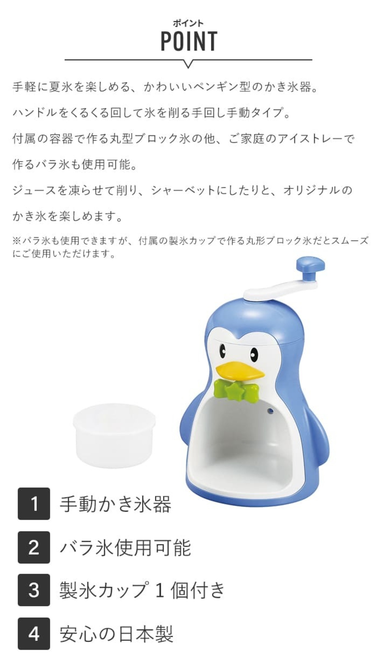 手軽に夏氷を楽しめる、かわいいペンギン型のかき氷器です。
