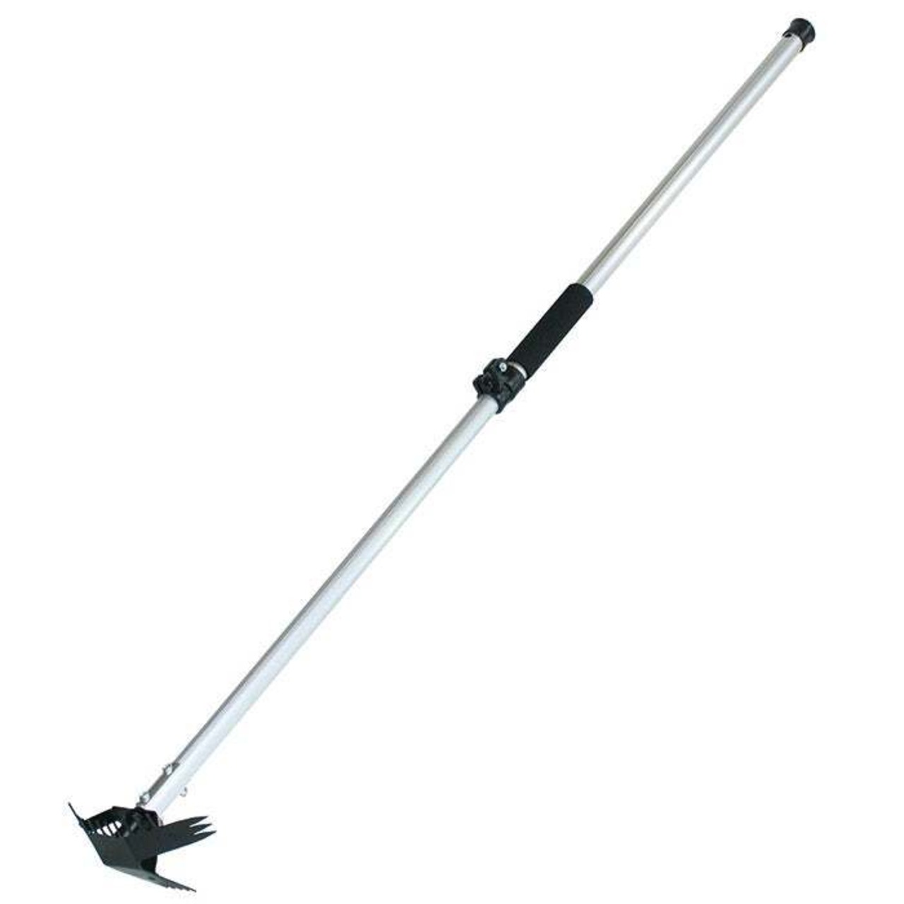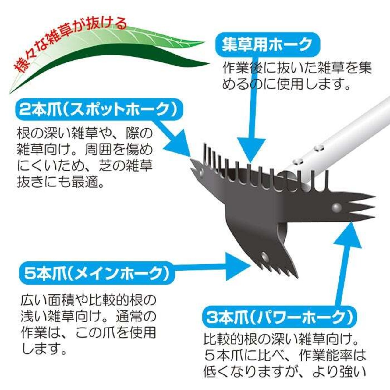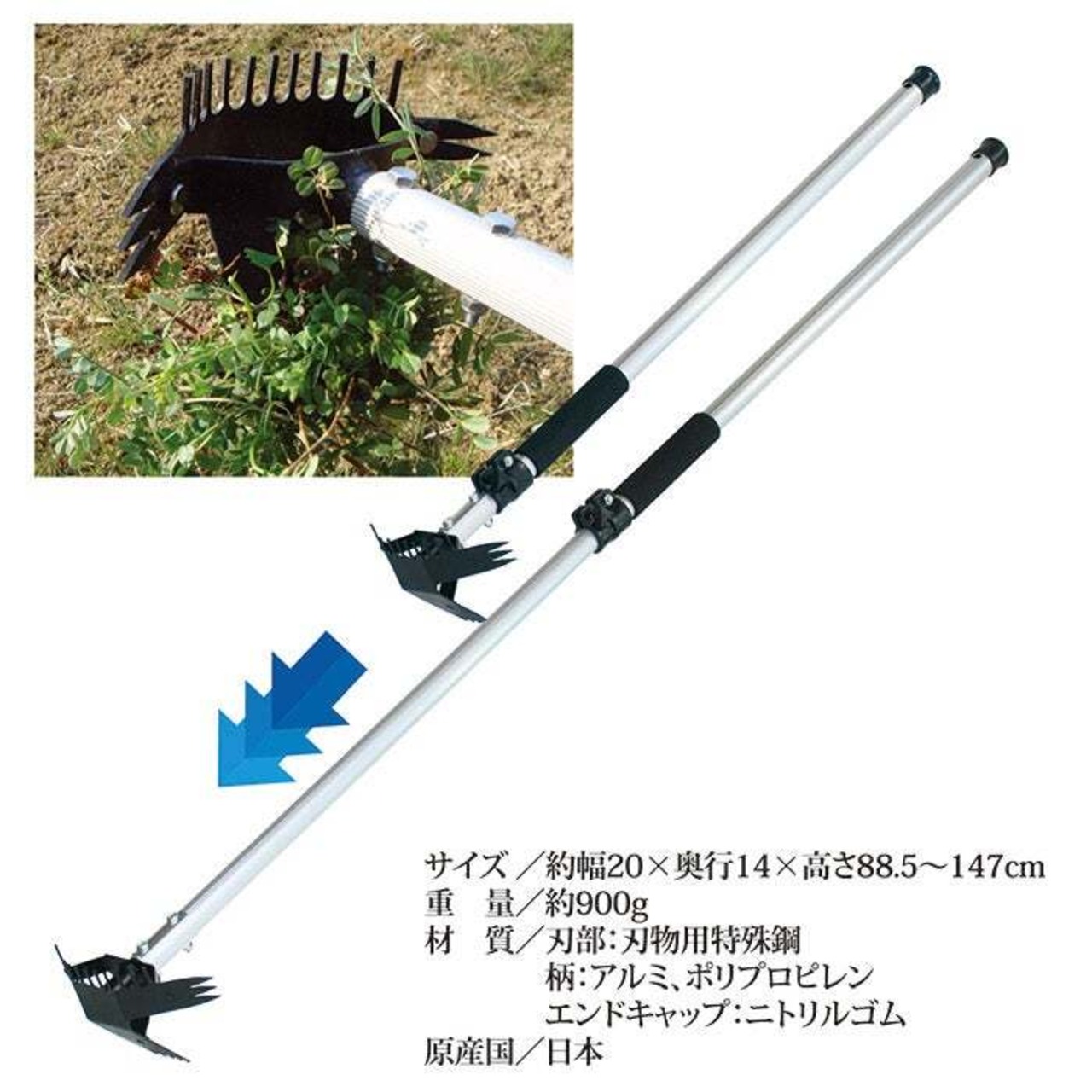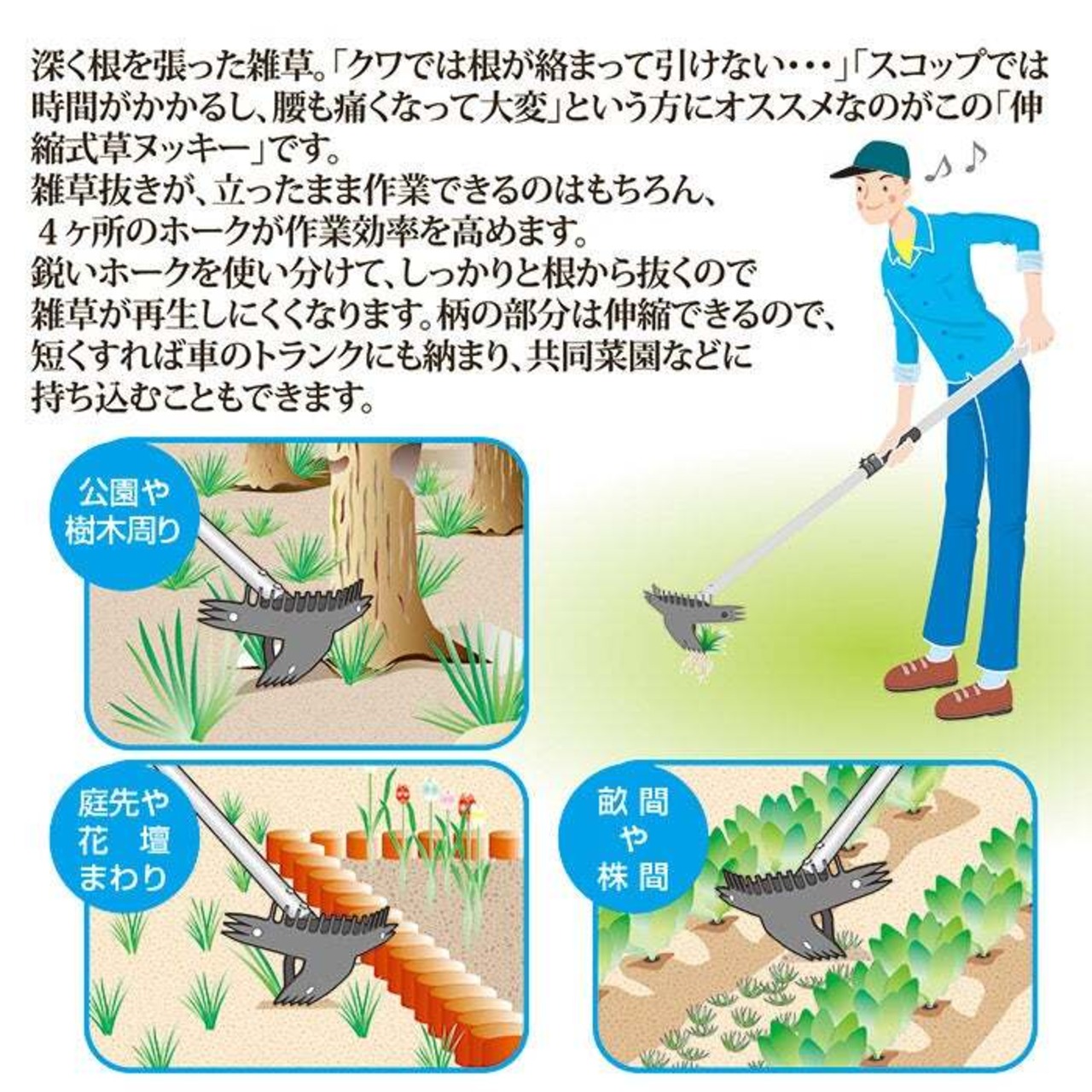 深く根を張った雑草。「クワでは根が絡まって引けない・・・」「スコップでは時間がかかるし、腰も痛くなって大変」という方にオススメなのがこの「伸縮式草ヌッキー」です。雑草抜きが、立ったまま作業できるのはもちろん、4ヶ所のホークが作業効率を高めます。鋭いホークを使い分けて、しっかりと根から抜くので雑草が再生しにくくなります。柄の部分は伸縮できるので、短くすれば車のトランクにも納まり、共同菜園などに持ち込むこともできます。