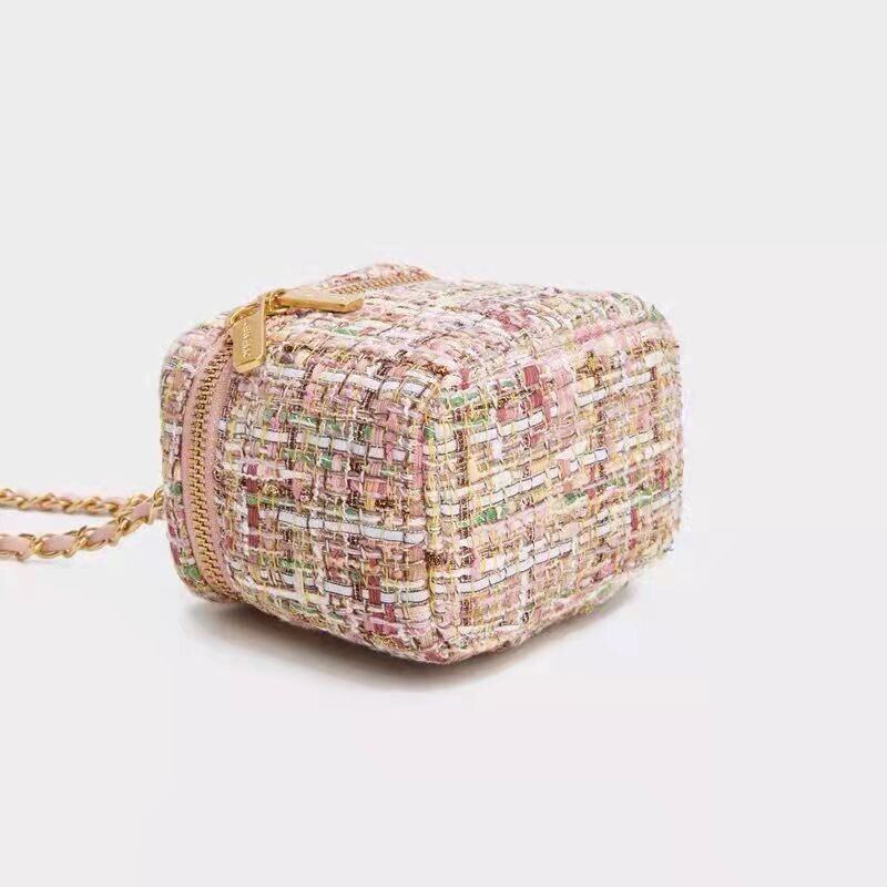 ・ミックスカラーのツイード調マイクロミニチェーンバッグ。