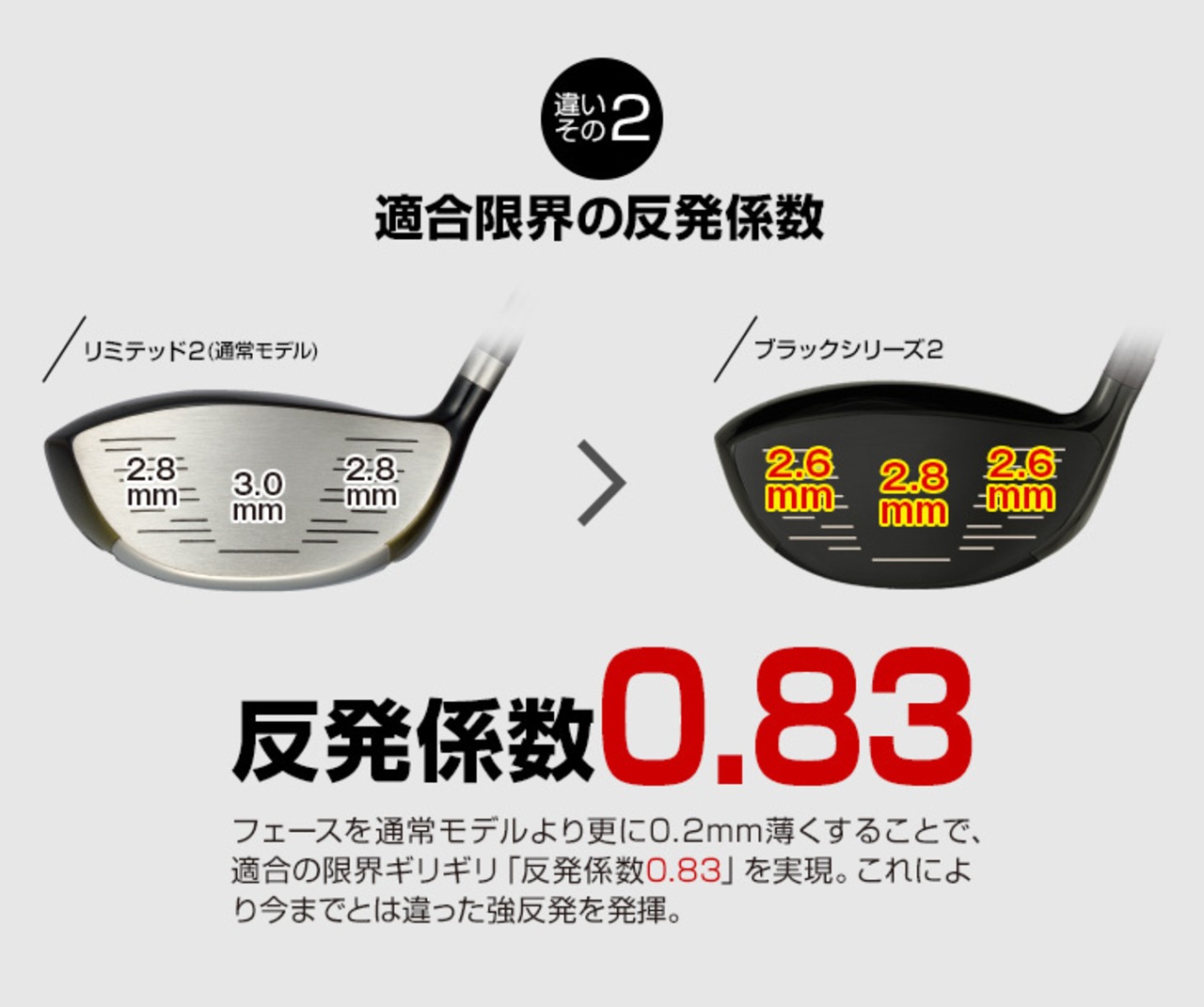 ただでさえ飛ぶ通常モデルをベースにさらに、チタン素材比10倍の硬度処理をプラスしたうえ、通常モデルよりさらに0.2ミリもフェース肉厚を削ぎ落として限界まで反発力を高めたルール適合極限反発仕様がマキシマックス ブラックシリーズ2です。