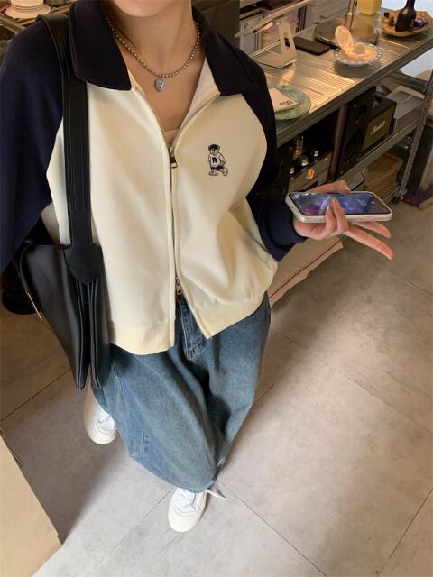 気質衝突カラーの開襟ジャケット刺繍婦人服カーディガンデザイン感小人数ゆったりオールマイティーな野球服カジュアルトップス