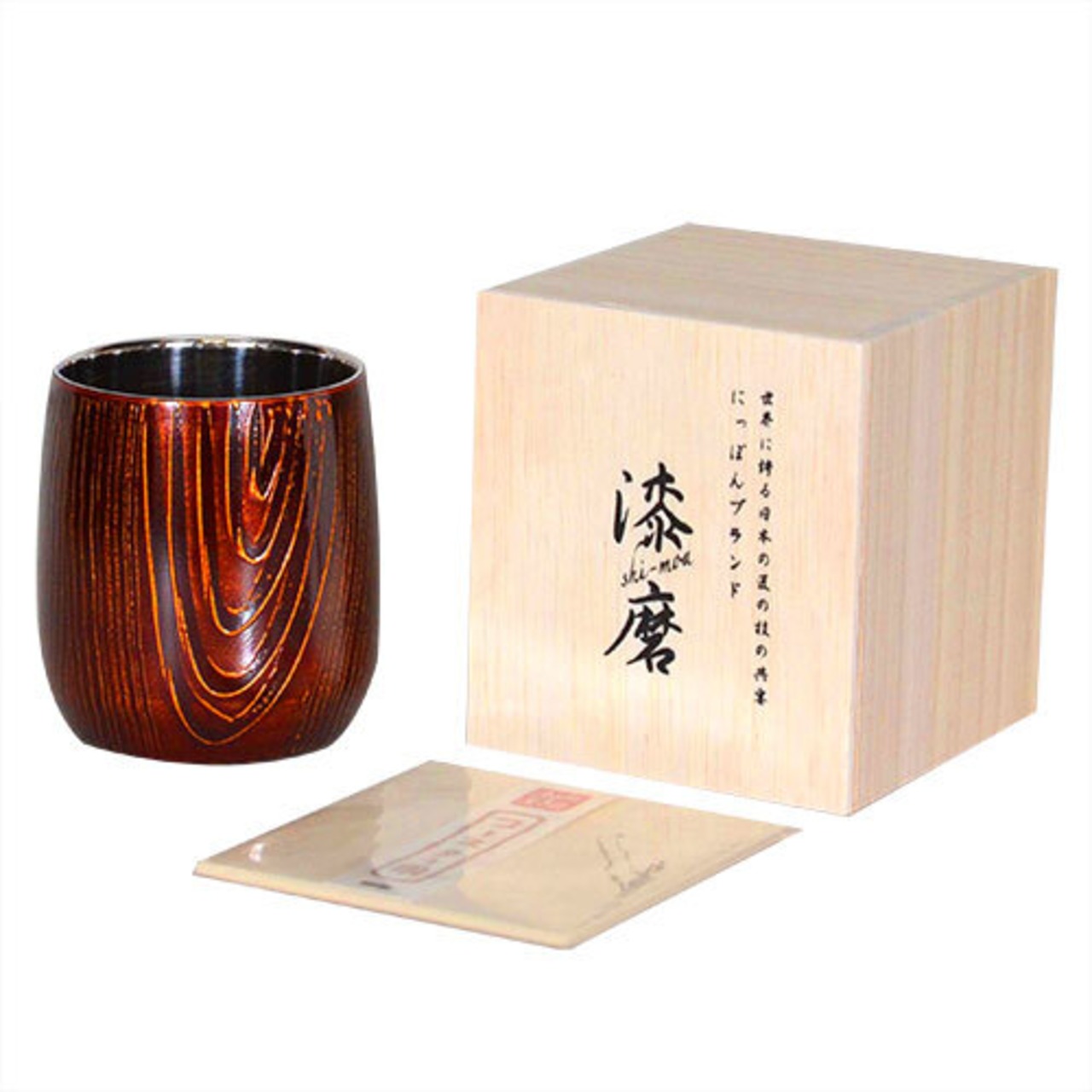 漆磨(シーマ)カップは、燕三条の研磨技術で仕上げたステンレスのボディに、伝統工芸・山中漆器の漆塗りを施したカップです。用の美にかなったフォルムと構造。そして用を超えた美術品のような美しさ。工芸技術と工業技術を融合させることで、他にない表現と機能性を生み出しています。●和然檀(ワモダン)シリーズとは木製のような温もりを感じさせる「和然檀」シリーズ。職人が手作業で描き出した模様は、木の年輪のごとく、ひとつとして同じものはありません。漆の色合いと細やかな塗りの技法によって、自然の中で年月を重ねた古木の風合いを再現しています。●漆の良さ、金属の良さを引き立ててカップ本体は18-8ステンレスを用い、新潟県燕三条で成形、研磨しています。内側上部は鏡面仕上げ、下部はらせん状の磨き筋をつけることで、ビールを注いだ瞬間に勢いよくクリーミーな泡が生まれます。二重構造になっているため水滴が付きにくく 、保冷性にも優れています。ステンレス素材の機能性を生かしつつ、外側を漆で仕上げることで、しっとりとした質感がプラスされ、口あたりもやわらかです。●福井県越前市の伝統工芸品「越前和紙」コースターを付属越前和紙は、福井県越前地方の岡太川流域で作られている和紙です。和紙の主な原料は、植物の表皮の内皮である靭皮繊維で、楮(こうぞ)・三椏(みつまた)・雁皮(がんぴ)などを用います。越前和紙の特徴は、豊かな感性を刺激する生成(きなり)色の優雅な美しさと、高い品質です。●産地紹介…石川県 加賀市(旧山中町)「山中漆器」国の伝統的工芸品に指定されている山中漆器の歴史は、今から400年以上前の安土桃山時代にさかのぼります。漆器は基本的に木地師が木を挽き、塗師が漆を塗り、蒔絵師が加飾をして完成します。山中漆器はろくろ挽きの木地づくりで国内屈指の技術力と生産量を誇りますが、塗りや蒔絵の技術にも優れています。●産地紹介…新潟県 燕三条「研磨技術」燕三条は、江戸時代の和釘づくりをルーツとする、高度で多様な金属加工技術が集積する地域です。その磨きの技のクオリティにApple社が惚れ込んだのは有名は話です。金属洋食器で国内シェア90%を占めるほか、ノーベル賞の晩餐会に採用されるなど、国内