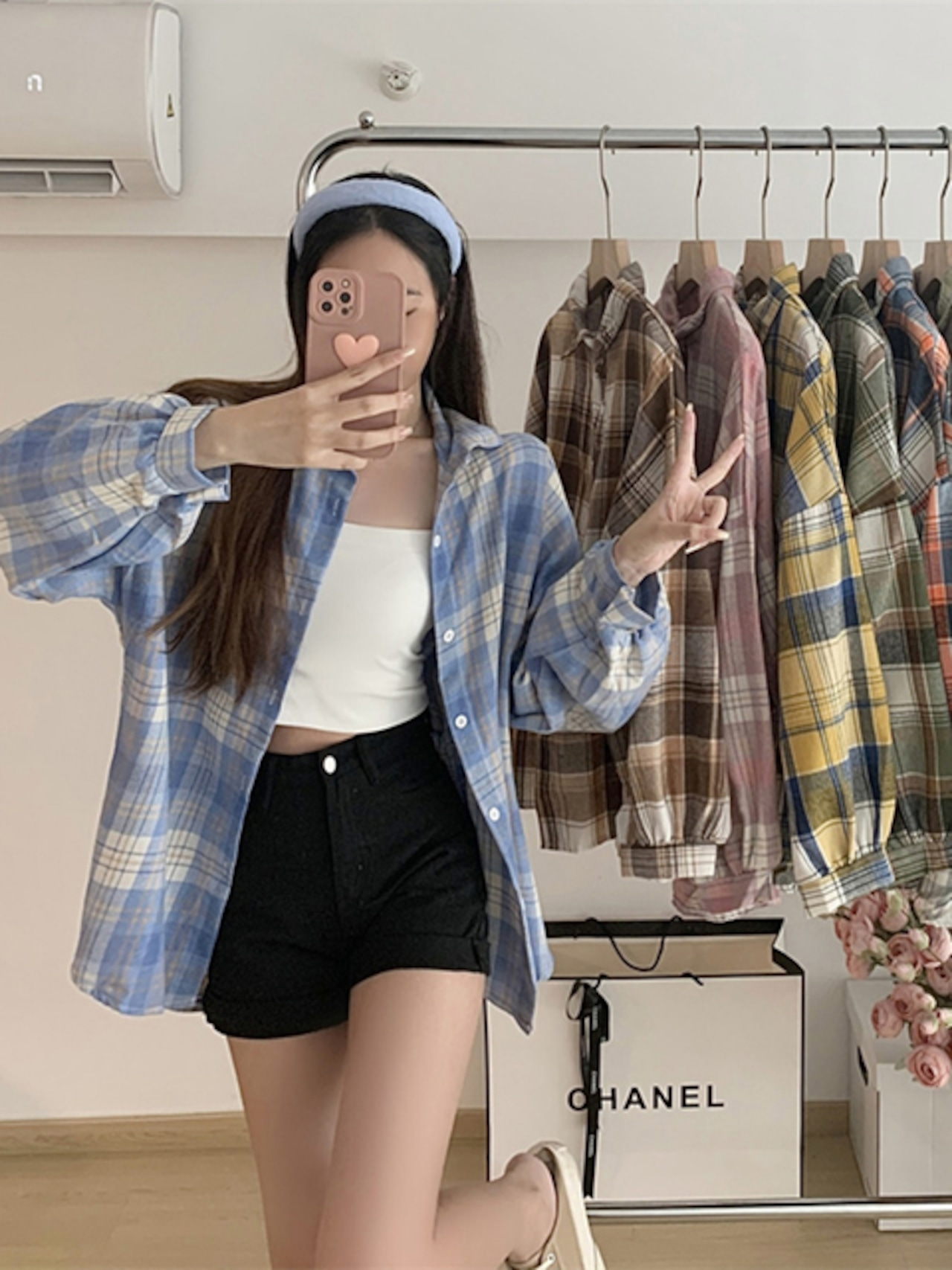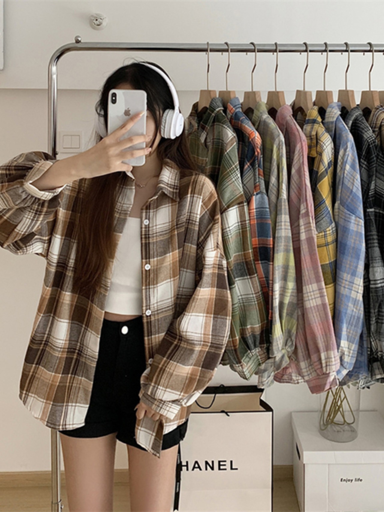 アメリカンレトロ長袖チェックシャツコートレディース春秋デザイン感小人数ゆったりシックで絶美なシャツトップス