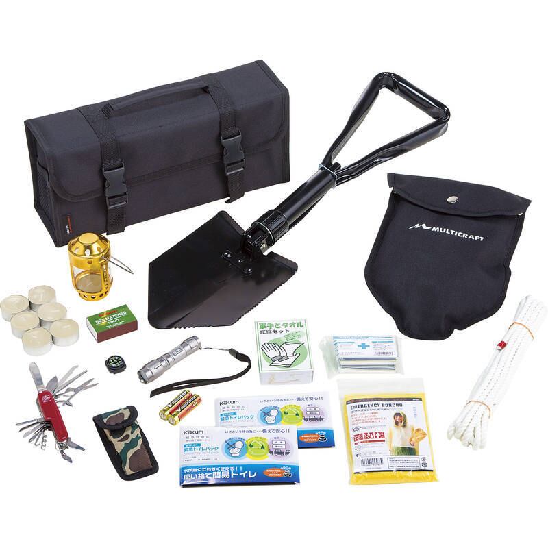 ケース:350×100×155mm、折りたたみスコップ・LEDライト(電池付)・20徳ツールナイフ・ポンチョ・IDホイッスル・コンパス・サバイバルシート・非常用圧縮2点セット・ミニキャンドルランタン・スペアキャンドル6個・マッチ・ロープ5m・緊急トイレパック