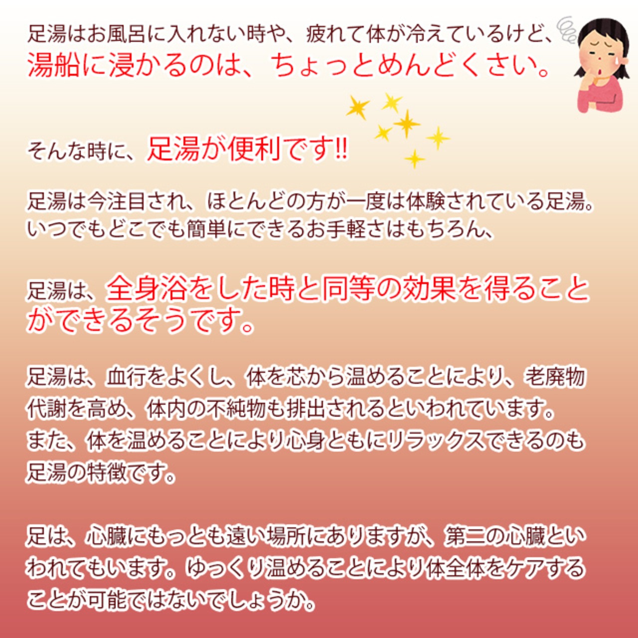 どこでも簡単に足湯ができます! 湯船に浸かるのがつらい時などに大活躍です!