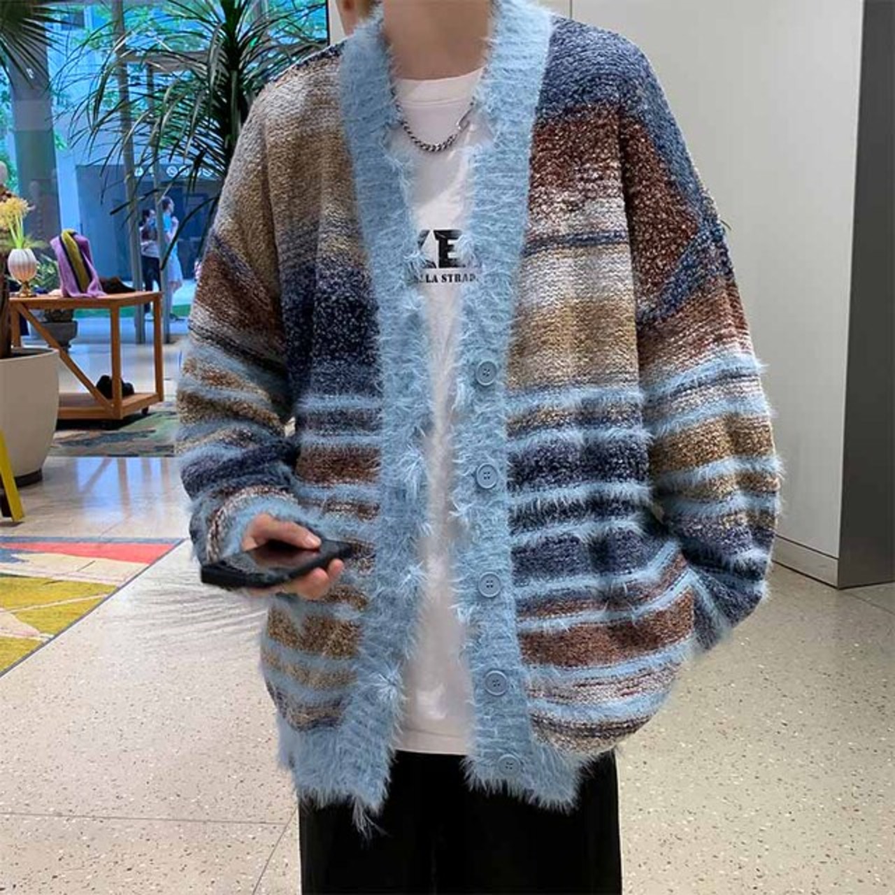 秋冬ボーダーグラデーションカーディガンコート男バリカジュアルトレンディブランド風レトロVネックニット