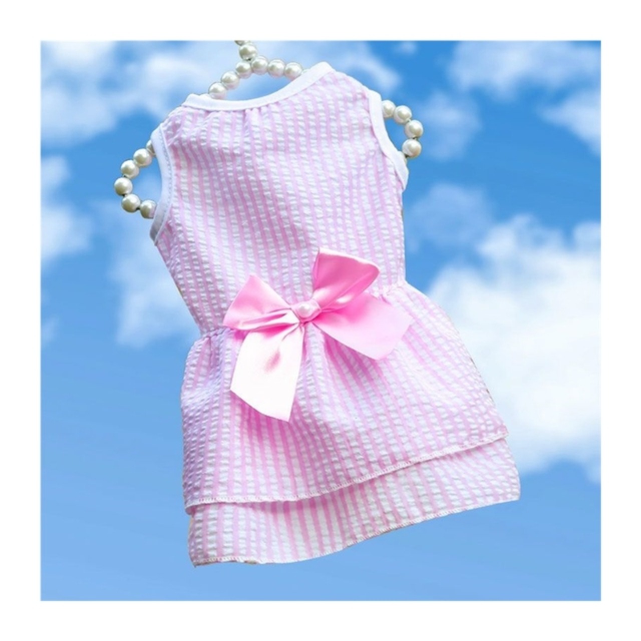 可愛い犬のためのスカートリボンドレスウェディングドレス。チェック柄とストライプ柄を組み合わせたおしゃれなデザインです。春夏秋にぴったりの涼しい素材で、愛犬の快適さも重視しました。結婚式やパーティーなど特別な日にふさわしい一着です。