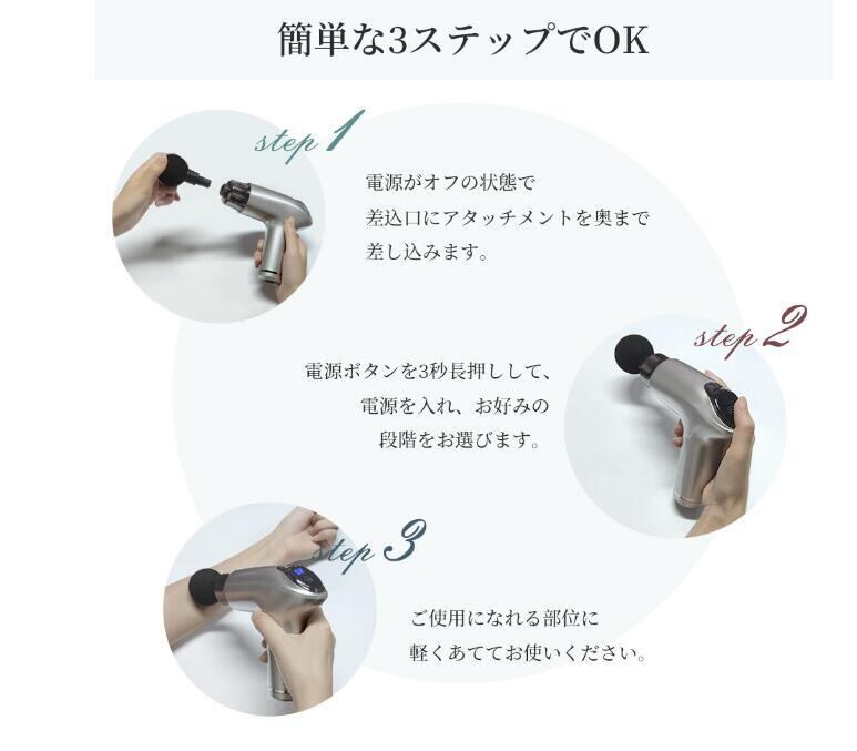 女性も持ちやすいコンパクト・軽量設計でありながら、最大振動数は3200回/分、のハイパワーで筋肉の奥深くまで振動を届けます。