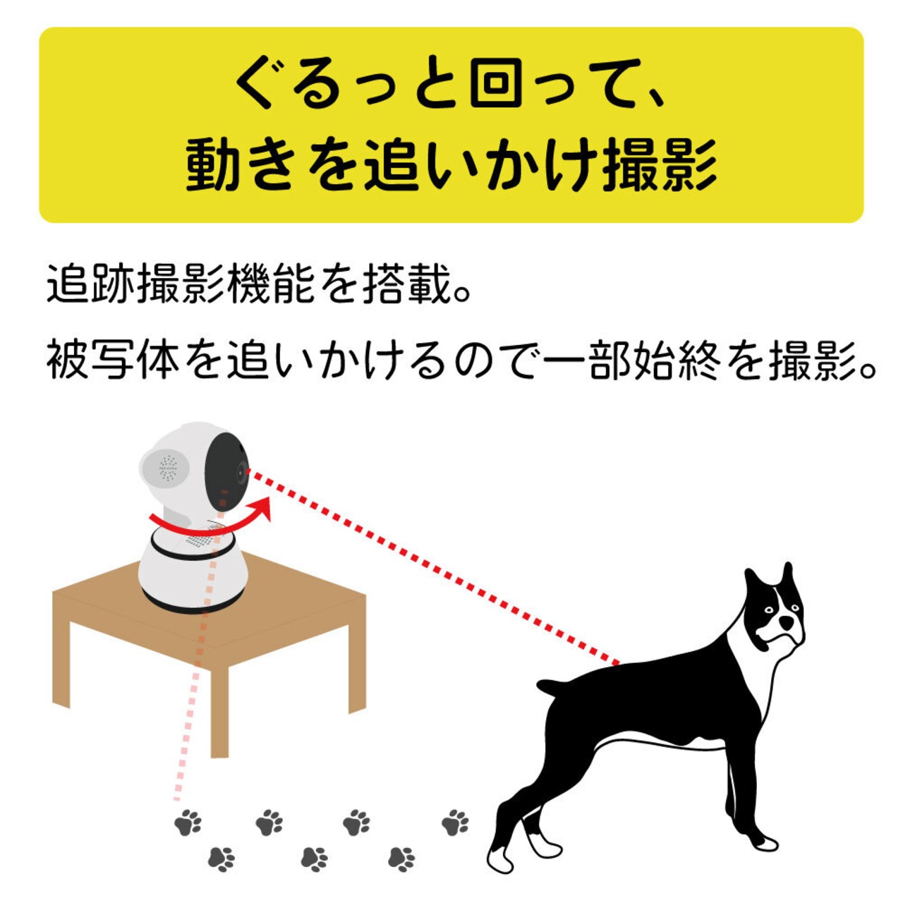 上下左右に首振り機能があり、自動で動く物を追いかける動体追跡機能があるため、家族やペットの様子を常に見守ることができます。
