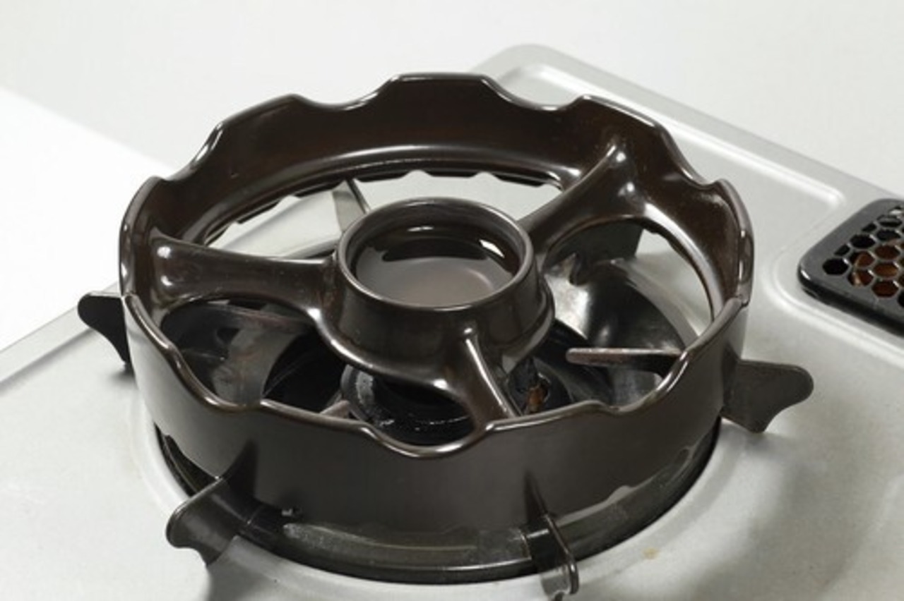 (3枚目)焼き台をコンロの五徳にのせて中央のくぼみに水を入れる。
