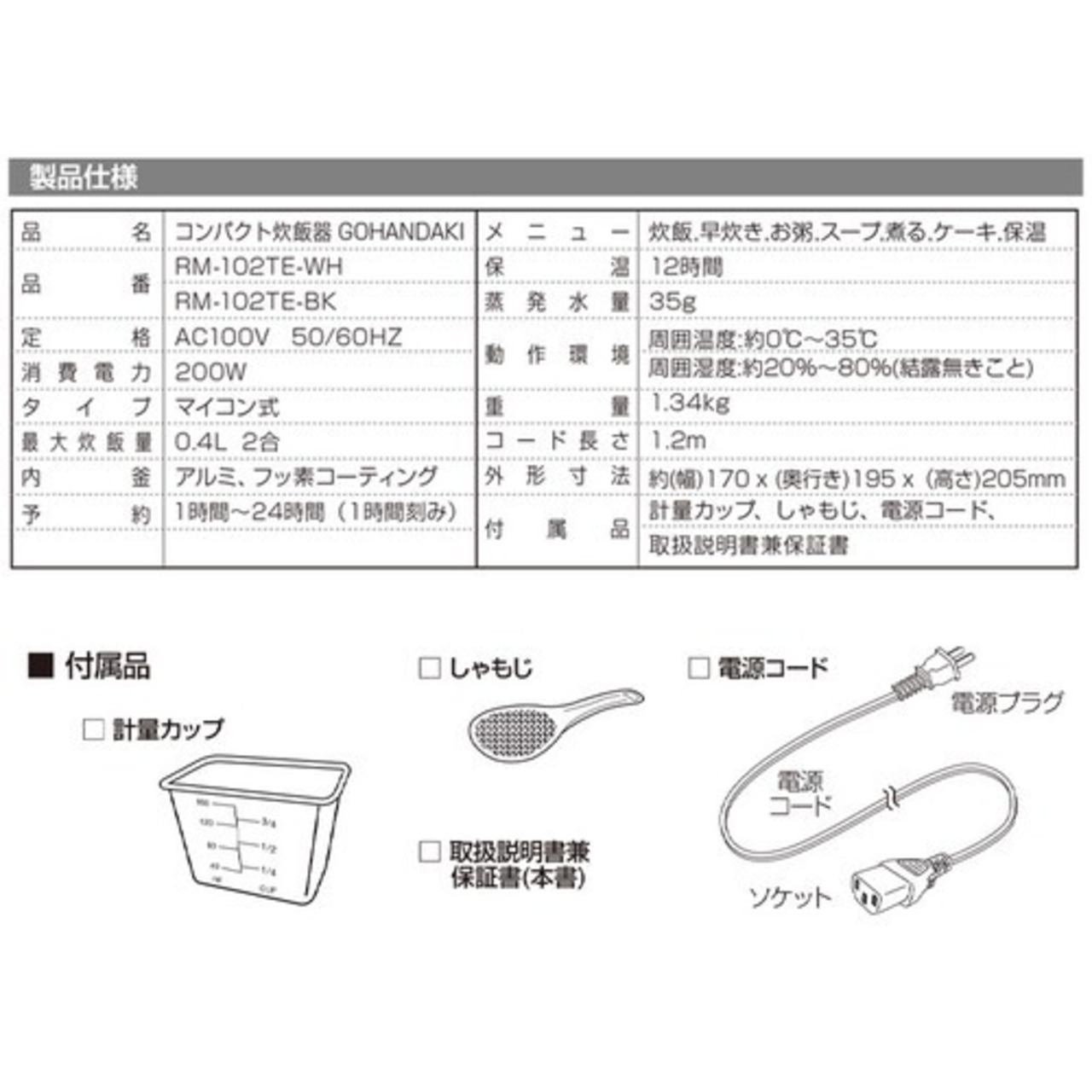 付属品:計量カップ・しゃもじ・電源コード・取扱説明書兼保証書