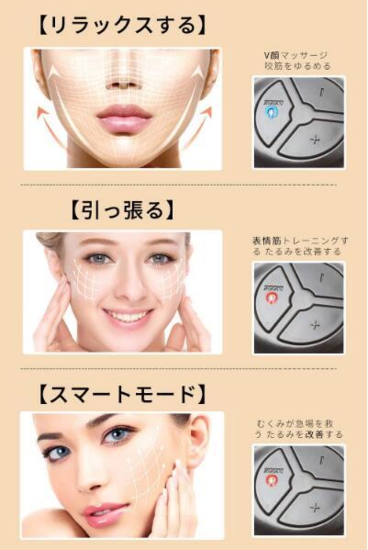 リラックスモード:リラックスする咬筋、V顔マッサージ;アップモード:ems微電流技術によりひっぱり締める,しわ防止、垂れ防止,スマートモード(総合モード):むくみ応急、引き締めしわ;ご注意:スマートモード時のみ振動します。リラックスモードとリフトアップモードでは振動しません。リラックスモードとリフトアップモードはEMS微電流原理を導入して、筋肉を刺激し、自動的に筋肉の収縮運動を行います。