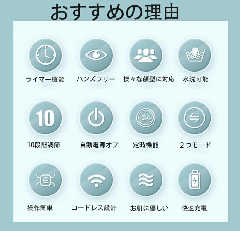 この美顔器は、長時間連続使用は避けてください。装着時に違和感や痛みを感じた場合は、すぐに使用を中止してください。妊娠中や皮膚に異常がある場合は、使用を避けてください。ご使用の際は、付属の取扱説明書をよく読んで正しくご使用ください。