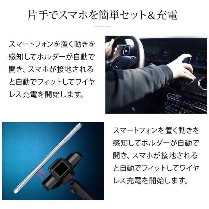 車載ホルダーとワイヤレス充電器が一体となった便利なアイテムです。スマートフォンを簡単に車載でき、同時に充電することができます。ホルダーは360度回転可能で、お好みの角度に調節することができます。ワイヤレス充電機能はスマートフォンに搭載されているQi対応端末に対応しています。