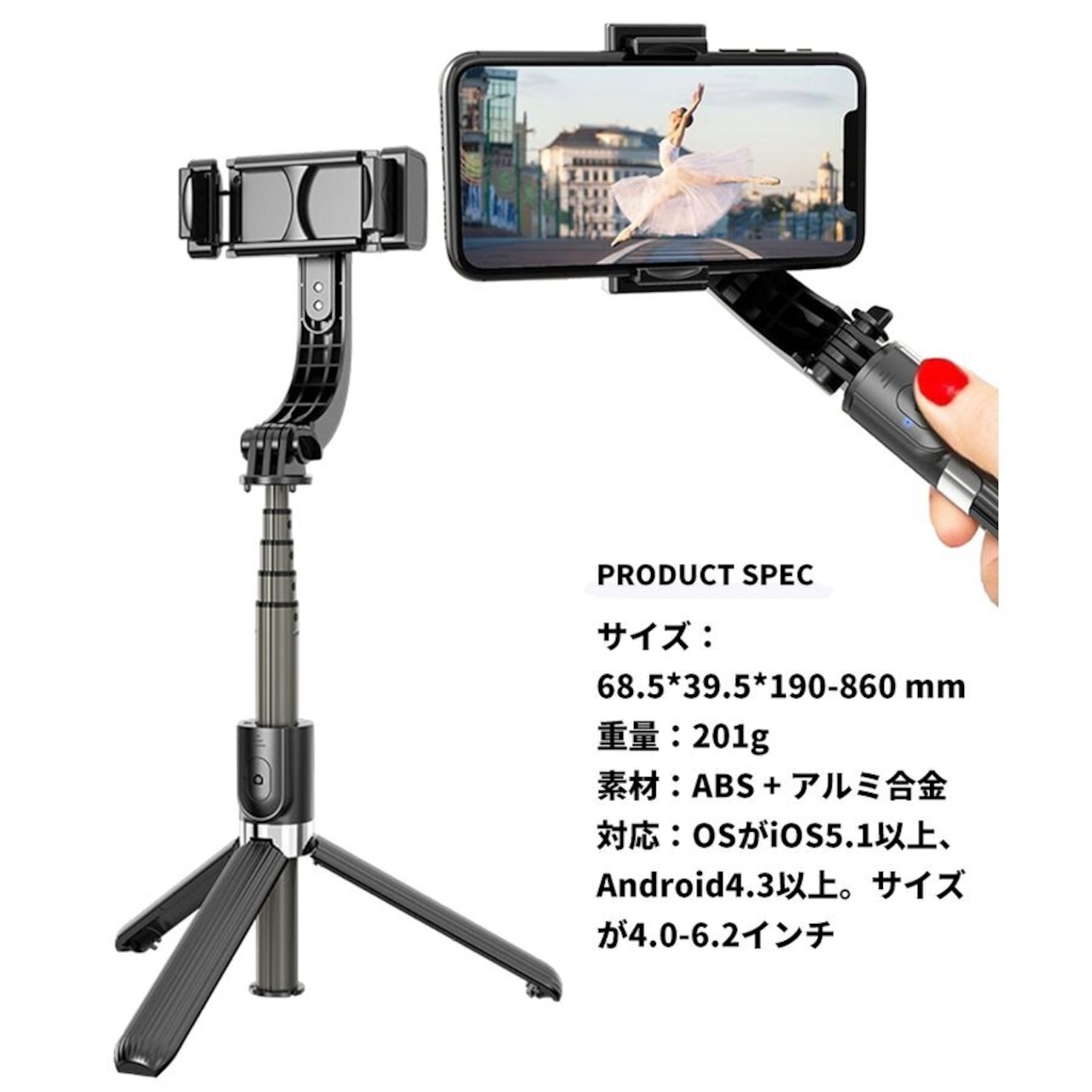 ■商品名■スタビライザー機能付き 自撮り棒■商品説明■動画の撮影に活躍する手振れを軽減するスマホ用ジンバル。手ブレを軽減するので専用の機材でプロが撮ったような、滑らかな動画が簡単に撮れます。自撮り棒、三脚、ジンバルの3機能なので旅行時に1つ持っていくと大変便利。歩きながらのライブ配信やVlog、ペットやお子様の撮影にもおススメです。■仕様■対応サイズ:4.0~6.2インチサイズ:68.5*39.5*190-860mm重量:201g材質:アルミ合金+ABSリモコン:iOS 5.1以上、Android4.3以上対応セット内容:本体、充電ケーブル、日本語説明書リモコンとスマホのペアリング方法1. シャッターボタンを長押しをしてLEDランプを付ける。2. スマホのBluetooth機能を起動し、自撮り棒のブルートゥース名を選択。3. 接続済みになれば接続完了し、LEDランプが消える。シャッターボタンを押した際、音声検索やズームが作動する場合は、カメラの設定で、音量ボタンの機能をシャッターに 変更してください。