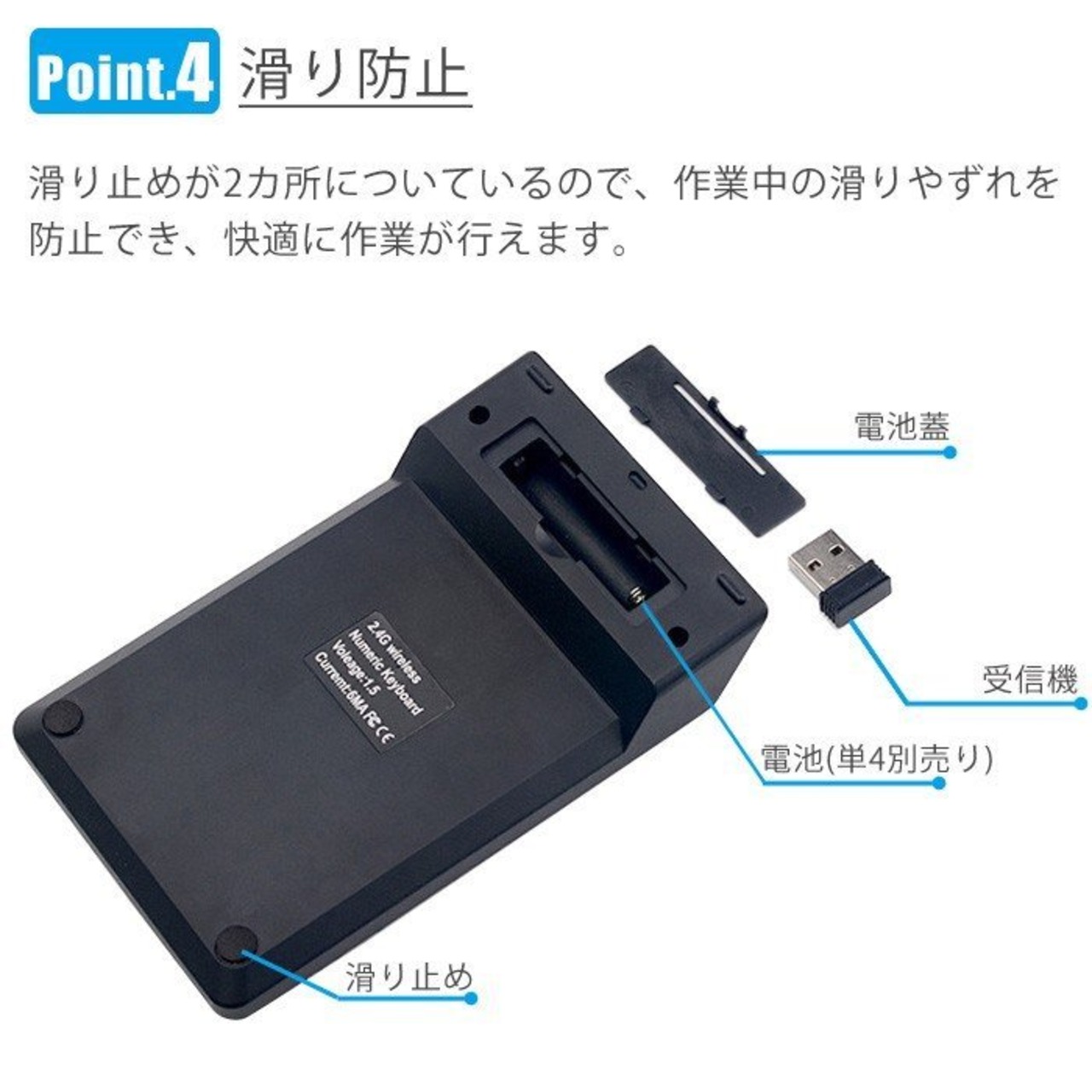 ■商品名■ワイヤレス テンキー■商品説明■2.4Gワイヤレスの携帯しやすいコンパクトテンキーボード。無線受信機のため好きな場所に使用できます! 会計処理、事務作業やレポート作成など大活躍!専用ドライバなどのインストール作業が不要で、 パソコンのUSBポートに接続するだけですぐに使えます!■仕様■サイズ(約):14.0×8.5×2.0(cm)対応システム iOS/WindowsXP/Vista/7/8/10接続方式:専用レシーバー(USB2.0対応,2.4GHz)接続可能範囲:最大10m材質:ABS樹脂電源:単4電池1本■注意事項■※画像は、ご覧になっているモニターやPCなどの環境により、実物と多少カラーが異なる場合がございます。色味やサイズが異なるなどのクレームはご対応致しかねますので、ご了承ください。