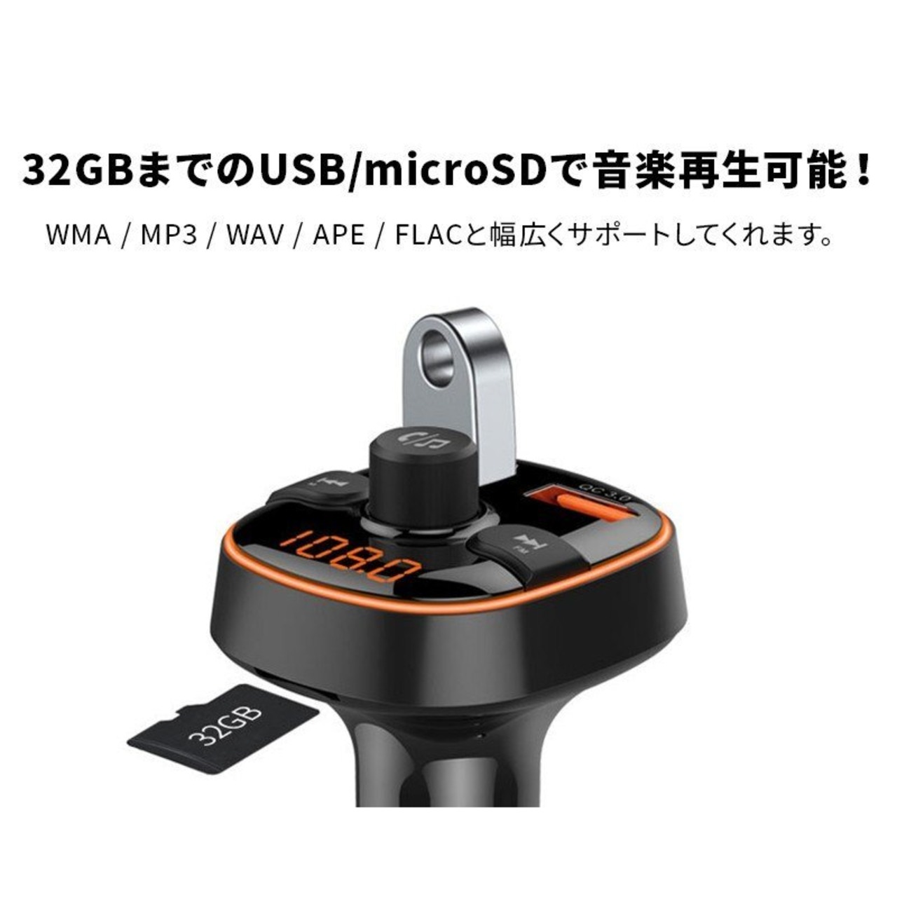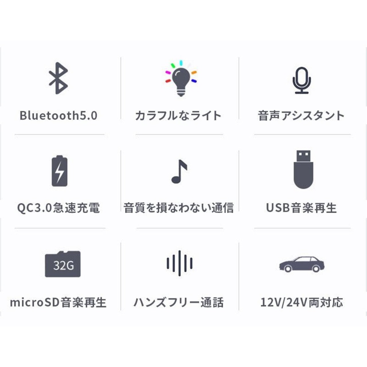 ■商品名■Bluetooth トランスミッター■商品説明■シガーソケットに差し込むだけ。これ1台で音楽・充電・ハンズフリー通話すべてをおこなえる、車載用Bluetoothトランスミッター。・ワンタッチでハンズフリー通話などの操作が可能。・SiriやGoogle assistantに対応。・USB 2ポート仕様(QC3.0急速充電 / 5V 2.4A)・スマホなどにBluetoothで接続するだけでなくUSBメモリやMicroUSBカードからも直接音楽を再生出来る。中央ボタン短押し:通話 / 終話 / 音楽再生 / 一時停止長押し:Google assistant / Siri / 起動 オフ本体左のライトボタンを押すとライトの色を切り替えられます。■商品仕様■Bluetoothバージョン:5.0 2台接続可Bluetooth通信距離:10M以内定格電圧:12V~24VUSB出力:12W+15W動作温度:0~50度音楽フォーマット: MP3 / WMA / WAV/ APE / FLACFM送信周波数:76~108Mhz