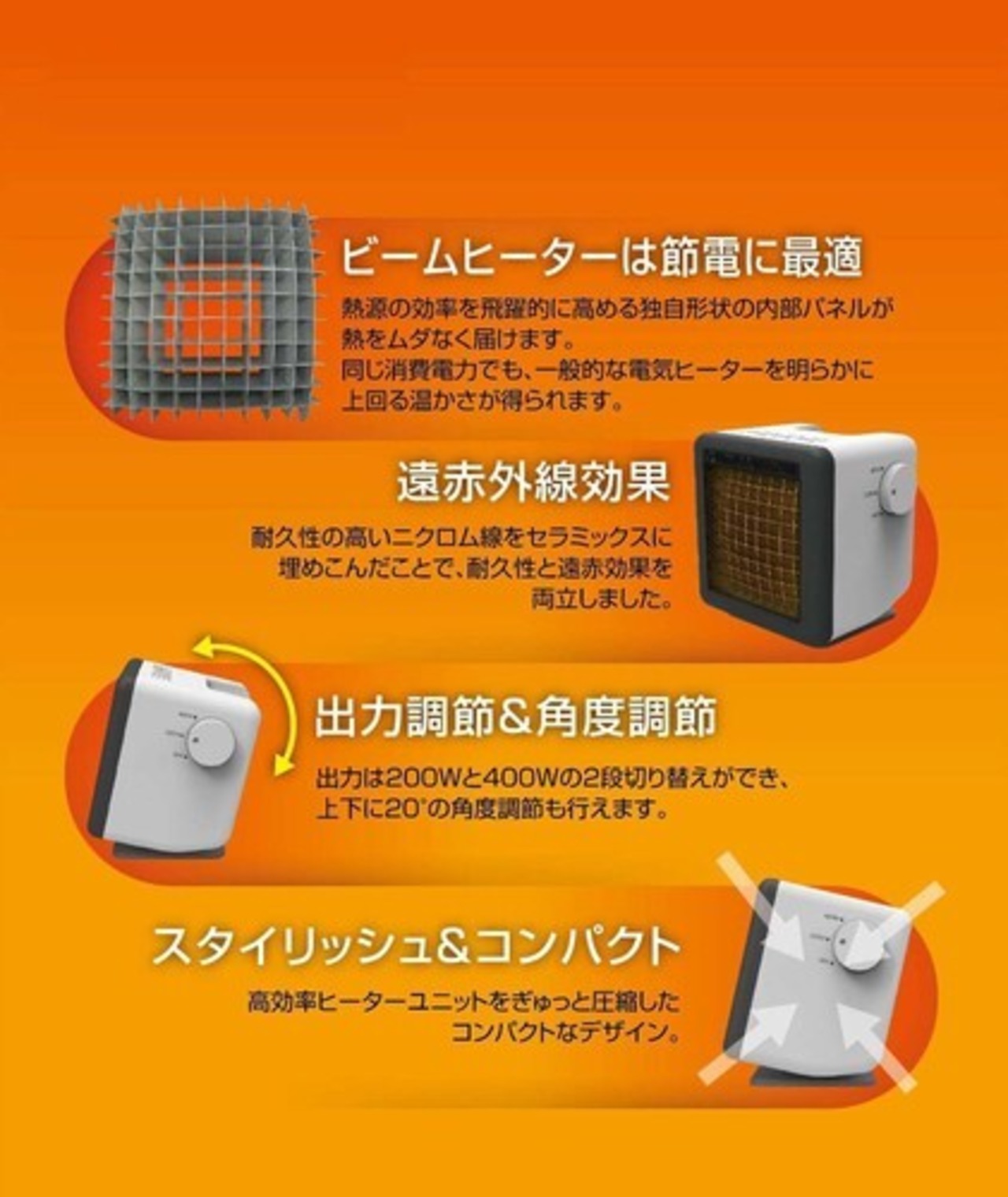 同じ消費電力で2倍の暖かさが感じられるキューブ型ビームヒーター