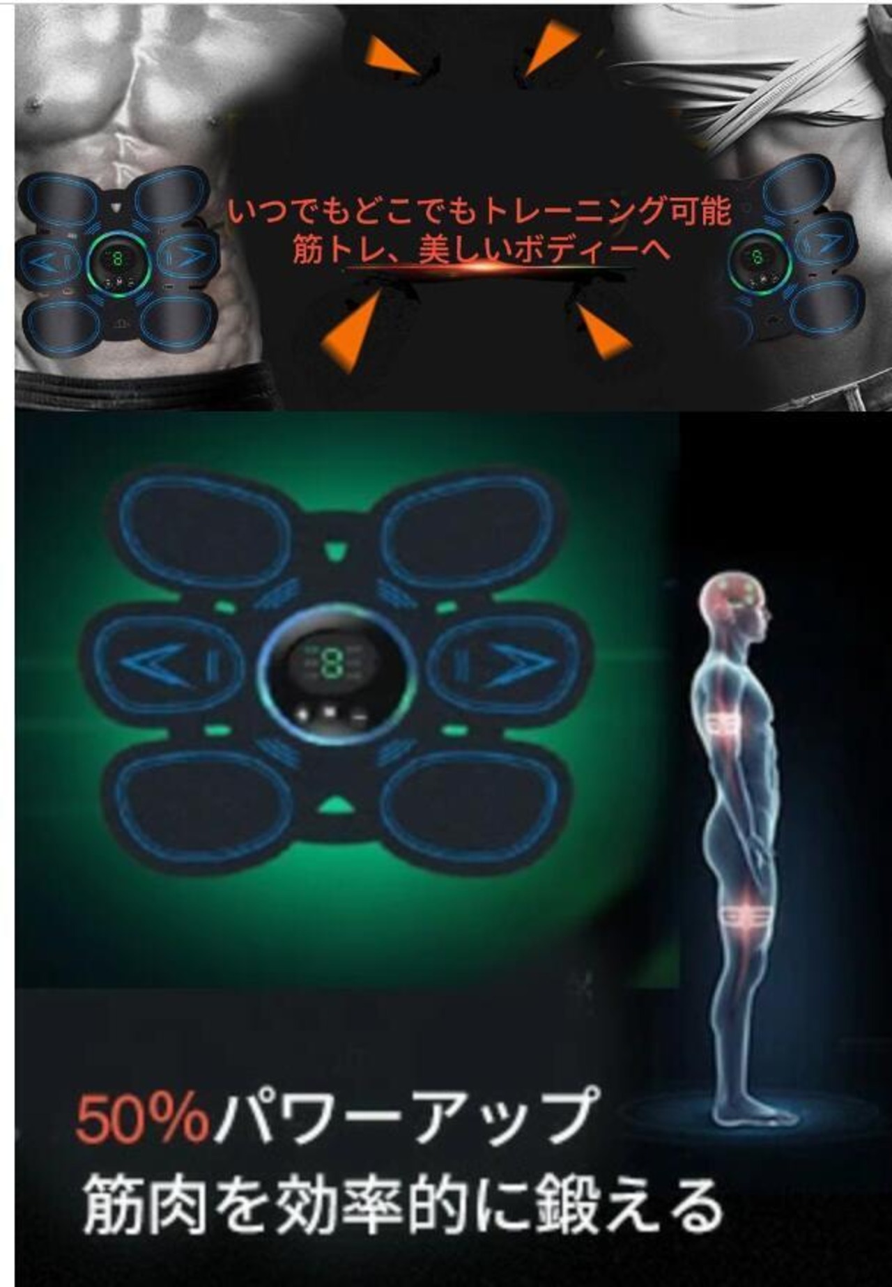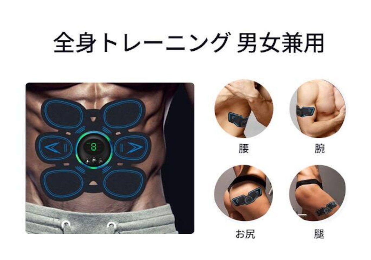 EMS(Electrical Muscle Stimulation:電気的な筋肉刺激)この製品は弱電流で、筋肉を収縮させることができます。弱電流によって刺激された筋肉はよりがっしりした効果が出ます。体につけてボタンを押せば、筋トレ開始します。薄くて軽い、簡単に身につけるトレーニング器具。服の上から目立たないので、いつでもどこでもトレーニングが行えます。読書や家事をしながら、出張先や旅行先で、さらに、通勤などの移動中でも使用可能。