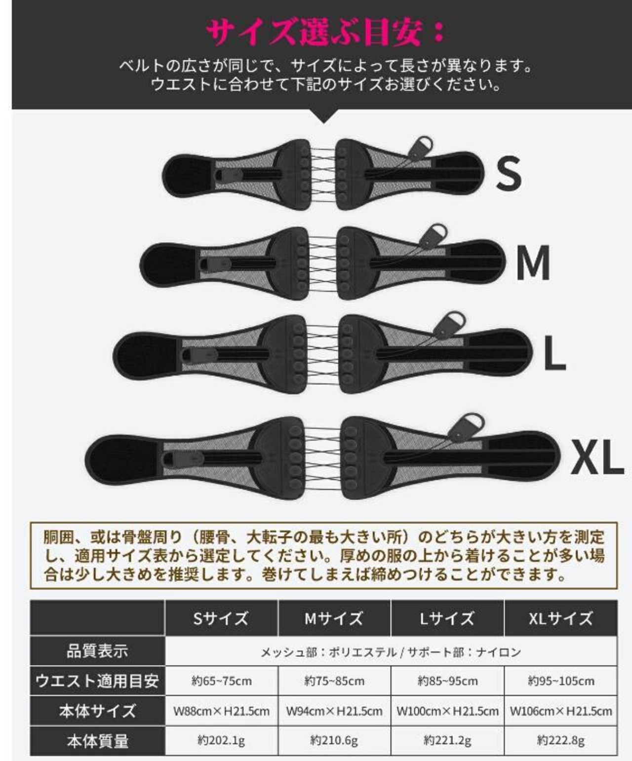 腰痛ベルトの使用にあたっては、正しいサイズの選択が重要です。お手元のウエストのサイズをご確認の上、ご注文ください。ベルトの装着方法については、商品とともに付属する取扱説明書をご参照ください。