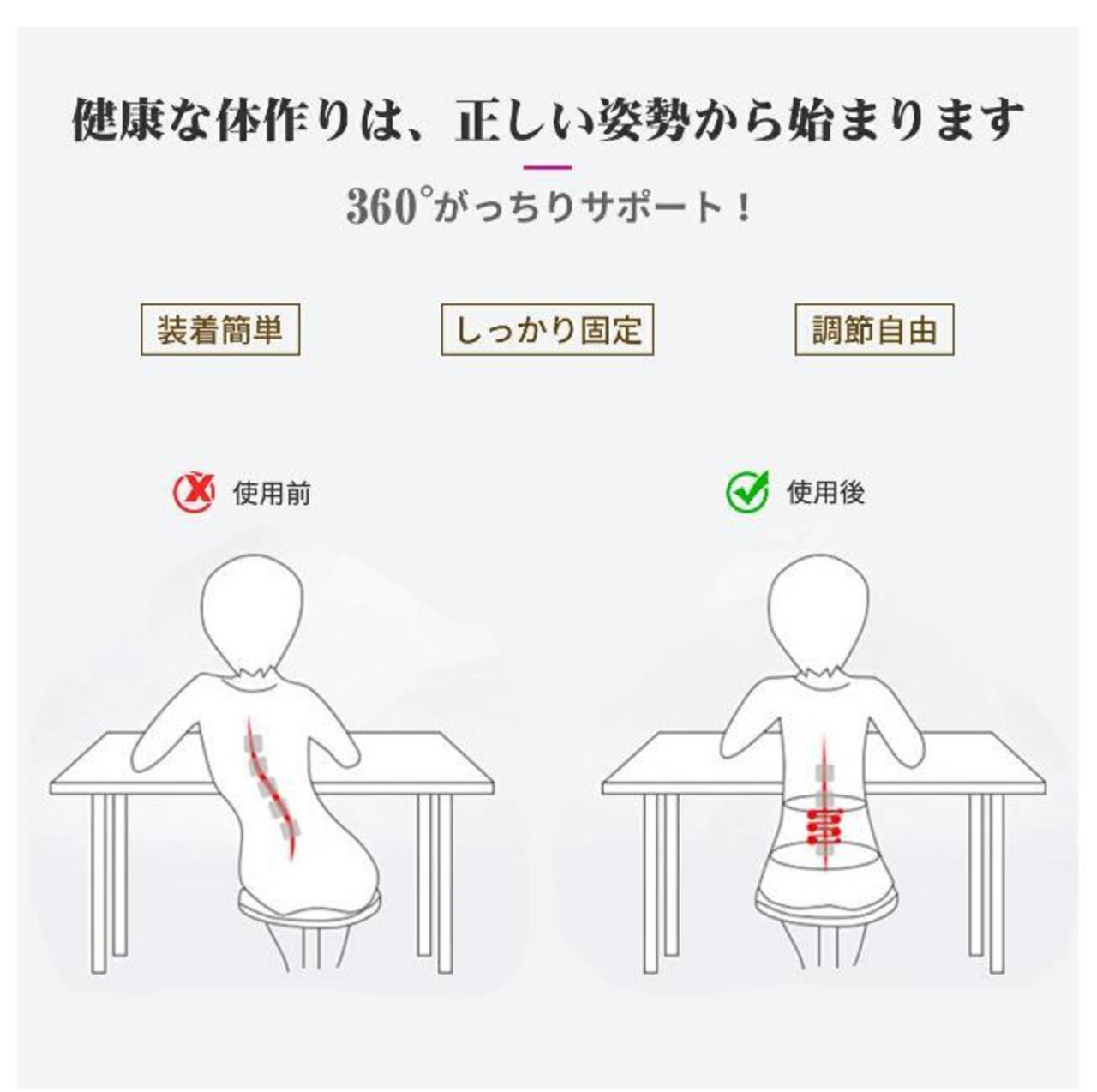 腰痛ベルトは、しっかりとしたサポート力と着心地の良さが特徴です。腰や骨盤の位置を正しく補正し、正しい姿勢をサポートします。これにより、腰への負担を軽減し、腰痛の改善に効果的です。