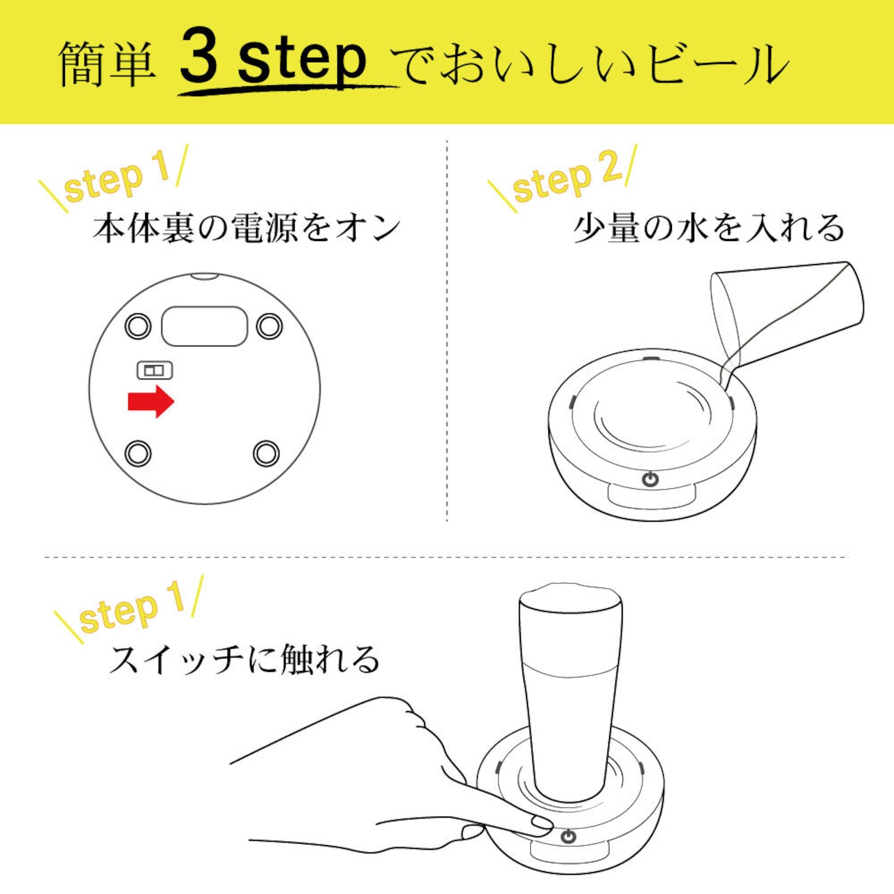 使い方はシンプル、面倒な準備は必要ありません。サーバーに少量の水を注ぎ、ビールの入ったグラスを置いて、スイッチを押すだけ。