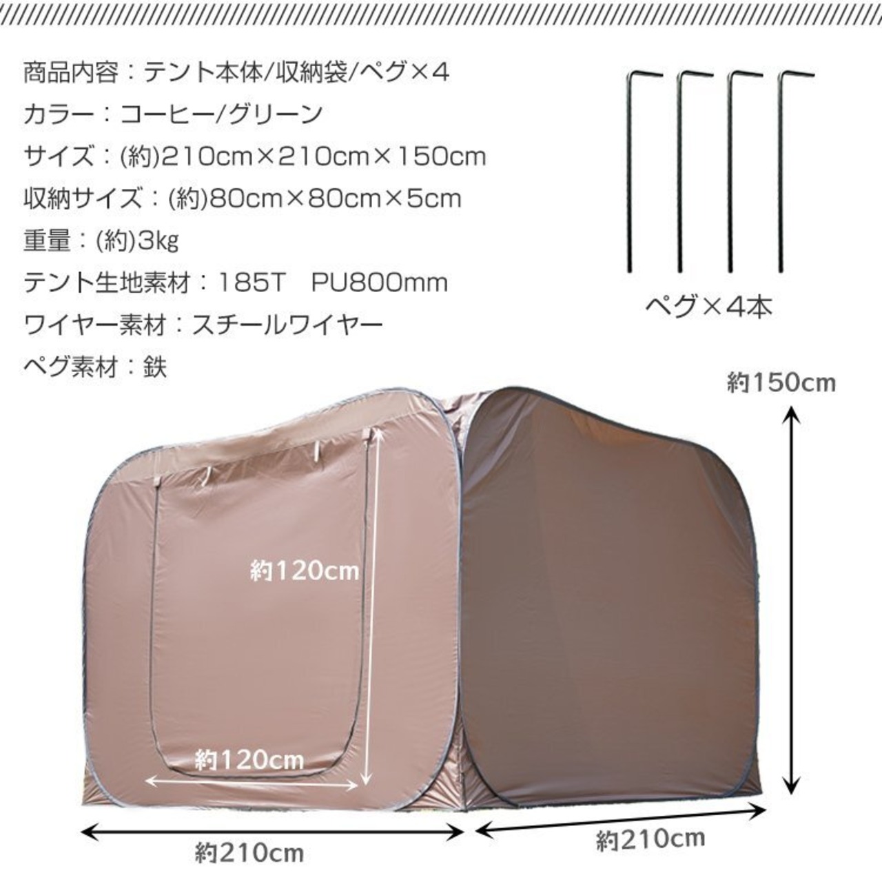 【テント生地素材】:185T PU800mm 【ワイヤー素材】:スチールワイヤー 【ペグ素材】:鉄